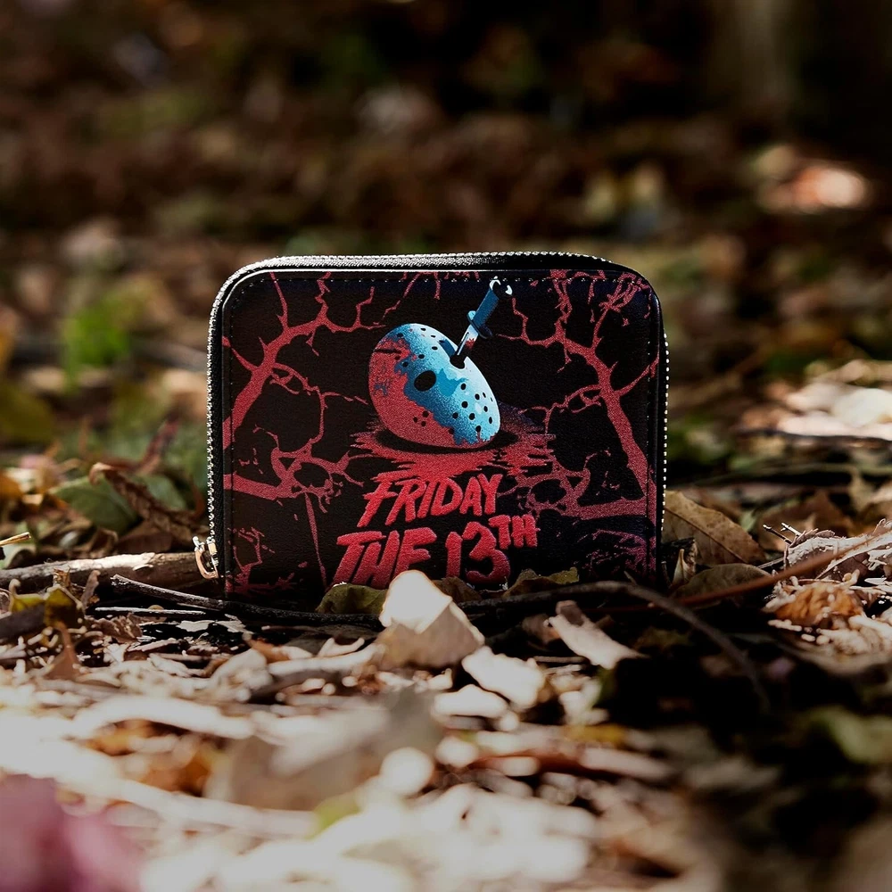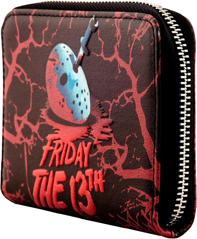 From the horror movie Friday the 13th, this wallet features Jason's Mask! Featuring incredible detail to bring Jason's Mask to life, this Loungefly wallet is made of vegan leather (polyurethane), zips closed with sturdy metal hardware, and has credit card slots as well as a clear slot for holding your ID. Note the unique, coordinating inside lining! Bring home a piece of Friday the 13th today! Pick up the glow in the dark Loungefly bag to go along with this in our other listing! Check out our other listings for combined shipping and thanks for looking! **Veteran Preference Female Owned Business**