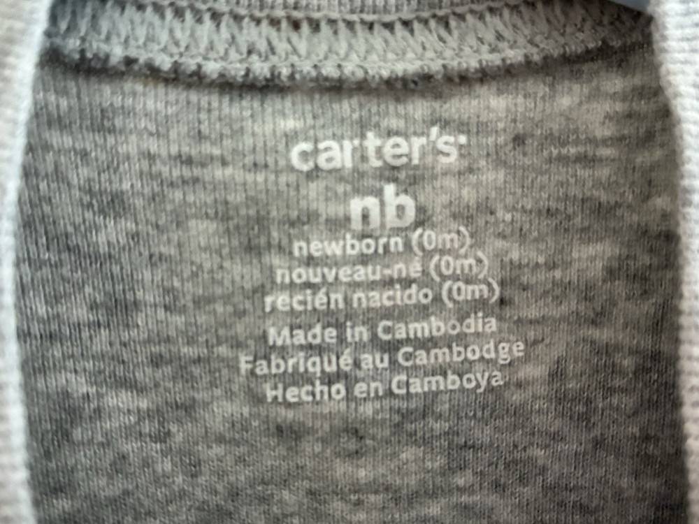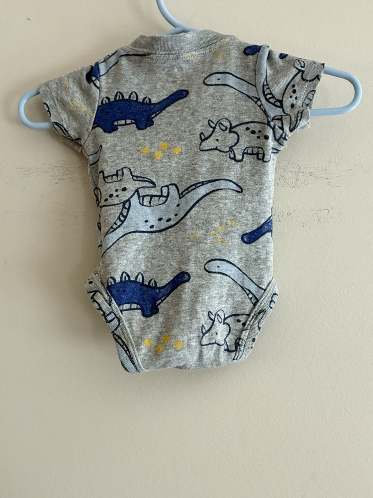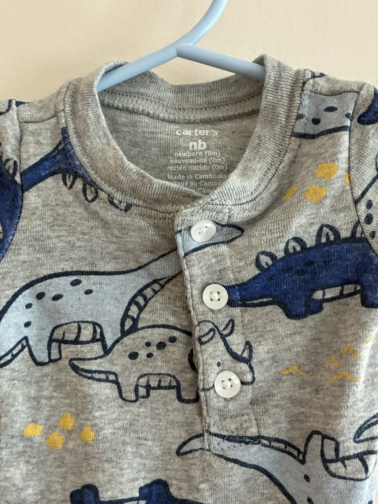 Carter's Baby Boy Blue Dinosaur 100% Cotton Henley Short Sleeve Bodysuit Gray NB. Condition is pre-owned. Smoke free, pet free home. Shipped via USPS Ground Advantage. In very good condition. Free of rips or stains.