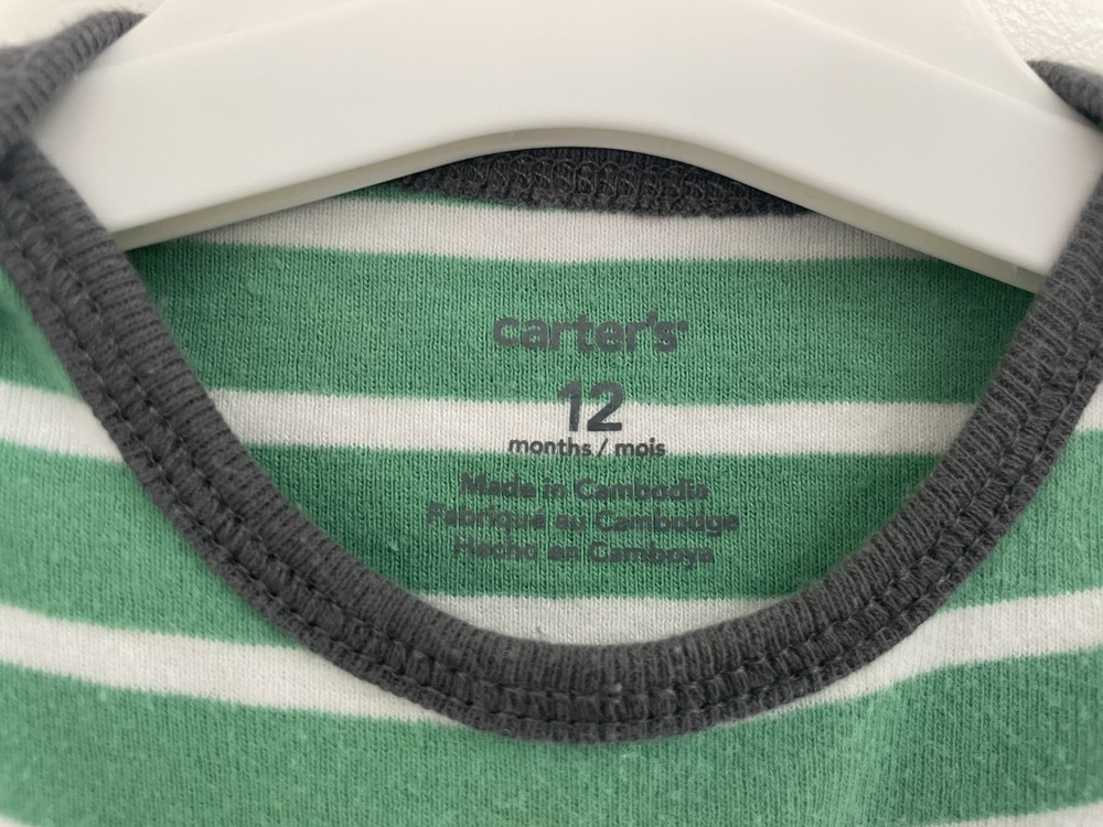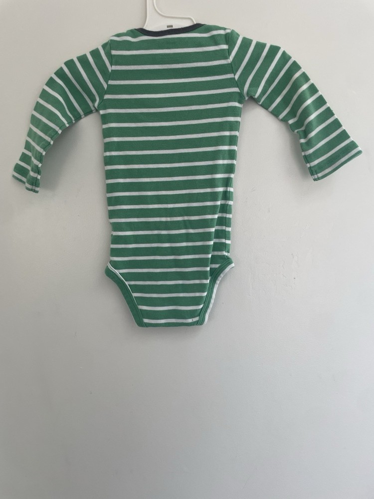 Carter's Baby Boy Little Speedster Striped Cotton Long Sleeve Bodysuit Green 12M. Condition is pre-owned. Smoke free, pet free home. Shipped via USPS Ground Advantage. In good condition. There are light stains on the front. Free of rips.