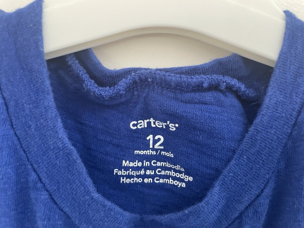Carters Baby Boy Mommy Loves This Guy 100% Cotton Short Sleeve Bodysuit Blue 12M. Condition is pre-owned. Smoke free, pet free home. Shipped via USPS Ground Advantage. In good condition. There is a snag in the fabric at the bottom by the buttons. Free of rips or stains.