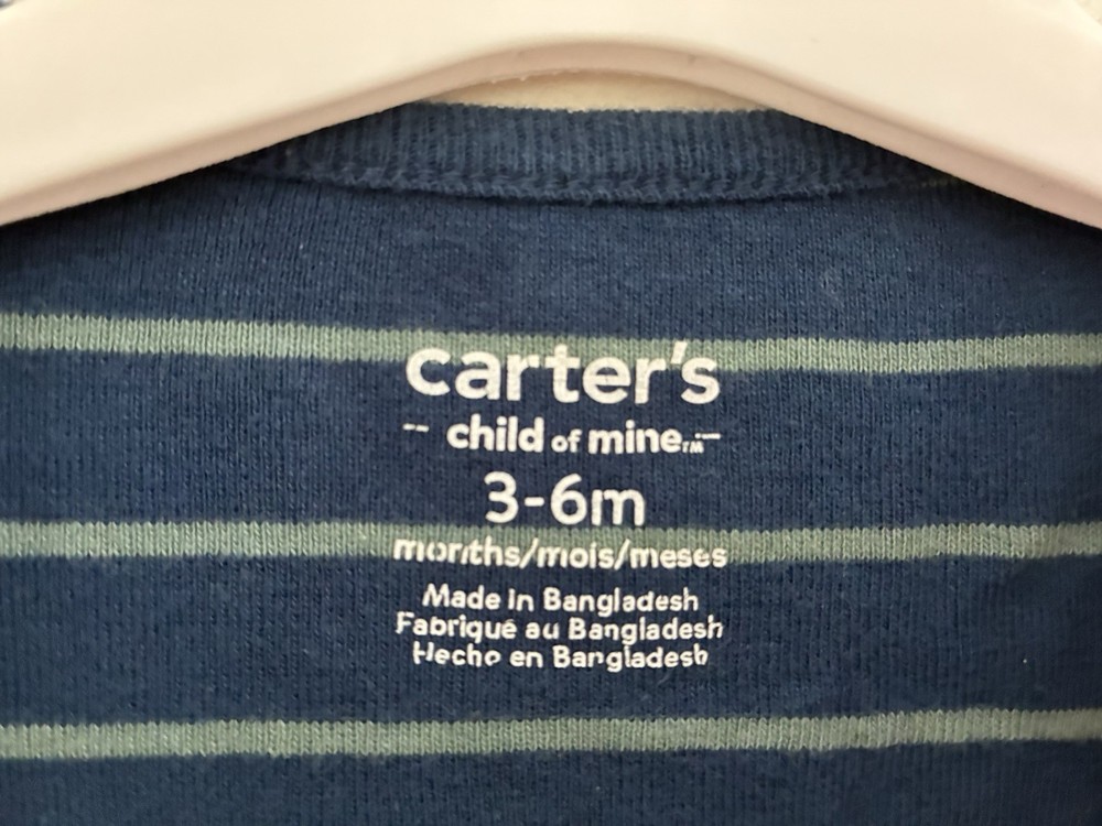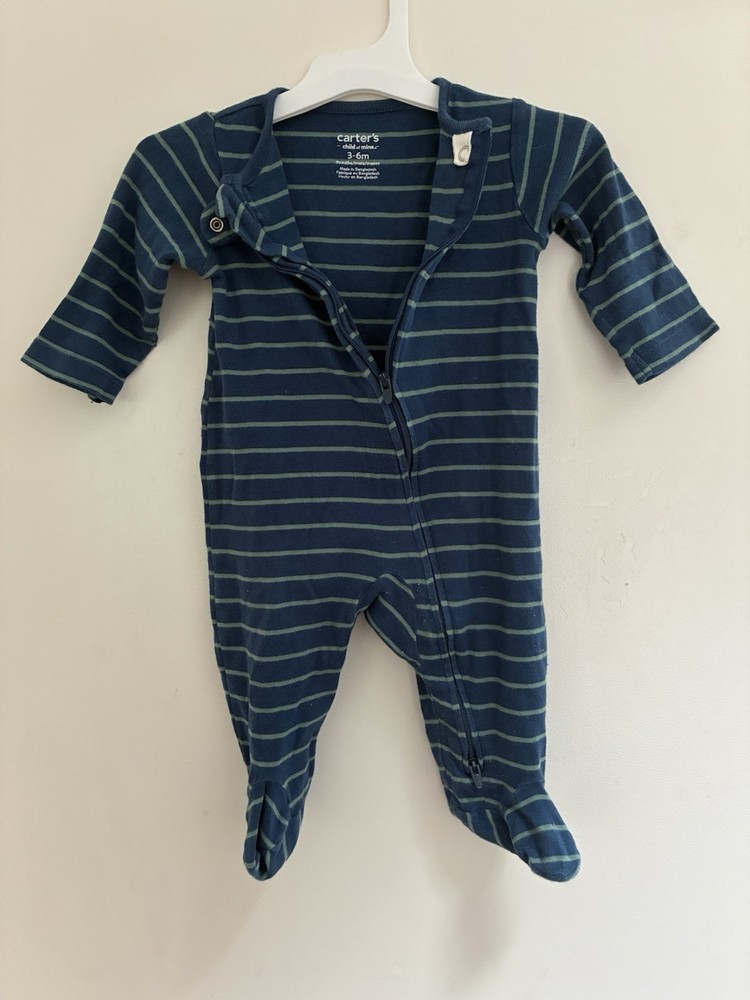 Style: Sleep & Play Closure: Zip Department: Boys Season: Fall, Spring, Winter Color: Blue Garment Care: Machine Washable Character: Boy Occasion: Casual Country of Origin: Bangladesh Features: Comfort, Easy Care, Lightweight, Stretch Accents: Zipper Material: 100% Cotton Size: 3-6 Months Pattern: Striped Handmade: No Number of Pieces: 1 Piece Brand: Carter's Type: One-Piece Seller Notes: “In very good condition. Free of rips or stains.” Sleeve Length: Long Sleeve