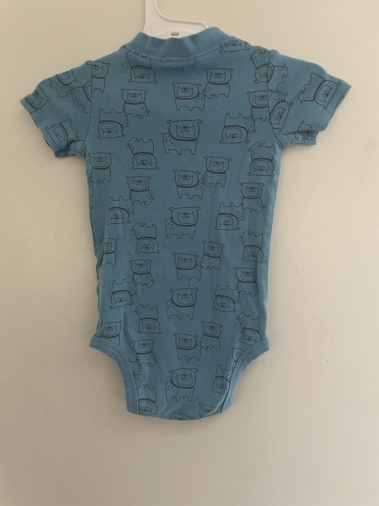 Carter's Baby Boys Cute Allover Dog Print Cotton Short Sleeve Bodysuit Blue 12M. Condition is pre-owned. Smoke free, pet free home. Shipped via USPS Ground Advantage. In good condition. There are light stains on the front. Free of rips.