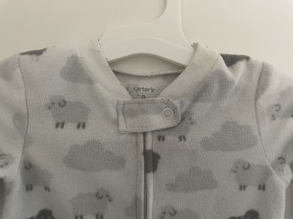 Carter's Baby Boys Cute Allover Lambs Cozy Fleece Zip-Up Sleep & Play White 9M. Condition is pre-owned. Smoke free, pet free home. Shipped via USPS Ground Advantage. In fair condition. There are stains on the front. Free of rips.