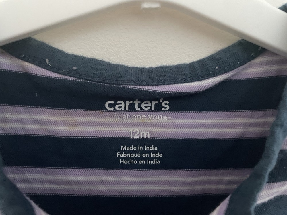 Brand: Carter's Neckline: Henley Season: Fall, Spring, Summer Seller Notes: “In fair condition. There are stains on the front and back. Free of rips.” Occasion: Casual Closure: Snap Style: Romper Number of Pieces: 1 Piece Set Includes: Shorts Sleeve Length: Short Sleeve Features: Comfort, Easy Care, Lightweight, Stretch Garment Care: Machine Washable Type: One-Piece Material: 100% Cotton Character: Boy Color: Blue Department: Boys Size: 12 Months Pattern: Striped Country of Origin: India