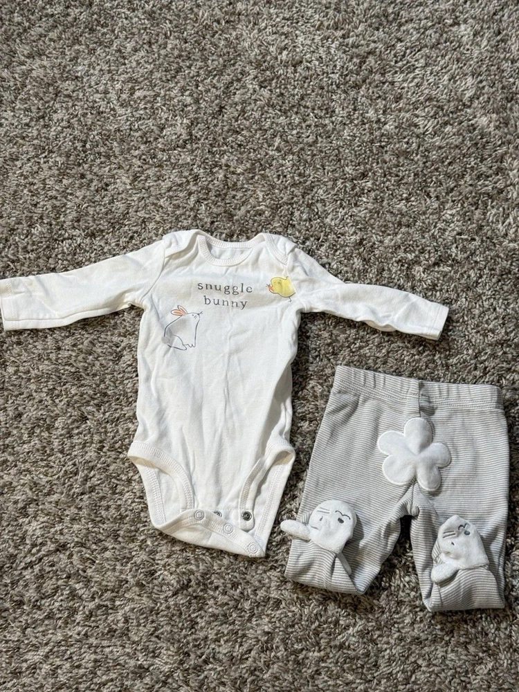 Carter’s baby outfit set in size 3 months, originally purchased specifically for Easter and worn one time only. This adorable neutral set features a long-sleeve ivory bodysuit with sweet bunny and chick graphics, paired with gray and white striped pants with attached bunny face footies and soft 3D ears, making it perfect for Easter photos, spring celebrations, or gifting. Made from soft, comfortable cotton with lap shoulders and snap closure for easy changes, and a gentle elastic waistband on the pants. Used once for Easter, then stored, this set is in excellent condition with no stains, holes, or wear. Ships fast — usually within 24 hours.