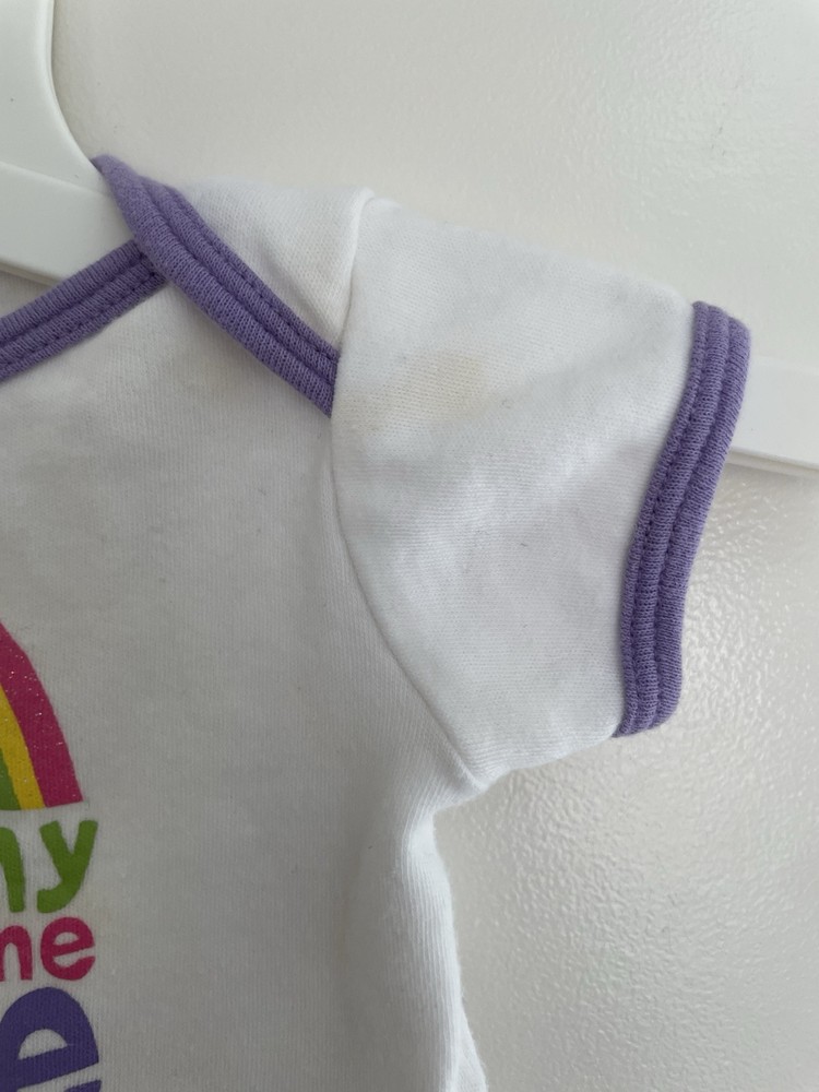 Carters Baby Girl Colorful Glitter Rainbow Cotton Short Sleeve Bodysuit White NB. Condition is pre-owned. Smoke free, pet free home. Shipped via USPS Ground Advantage. In good condition. There are stains on the front. Free of rips.