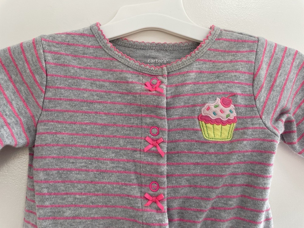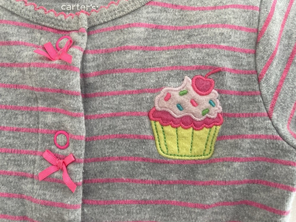 Carter's Baby Girls Cupcake Applique Striped Cotton Snap-Up Sleep & Play Gray 6M. Condition is pre-owned. Smoke free, pet free home. Shipped via USPS Ground Advantage. In very good condition. Free of rips or stains.