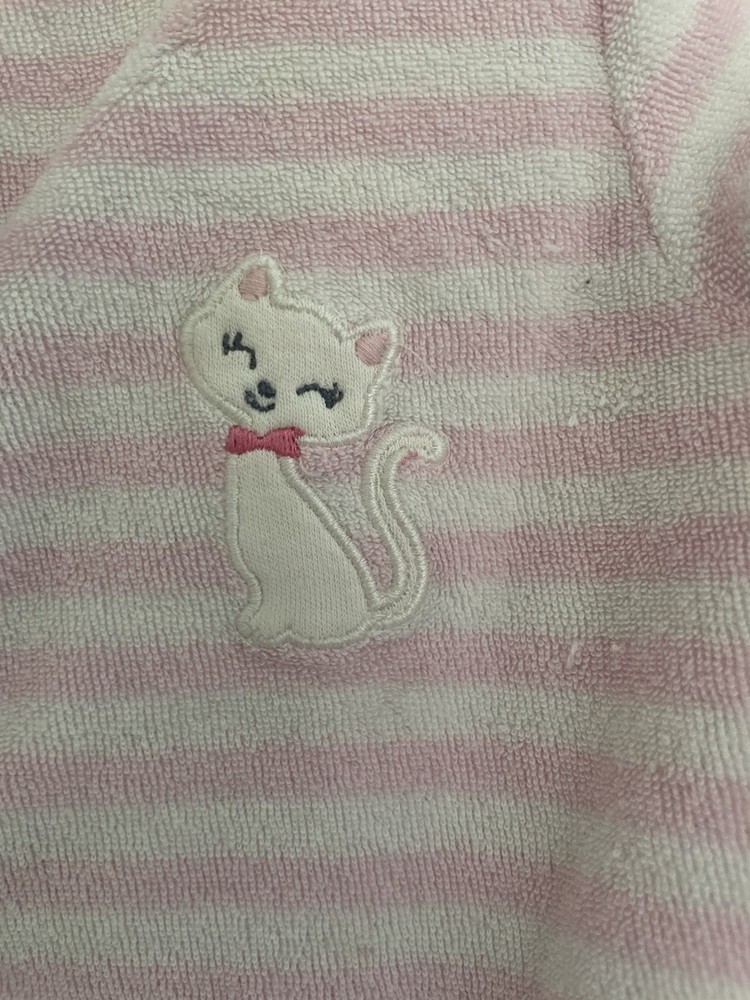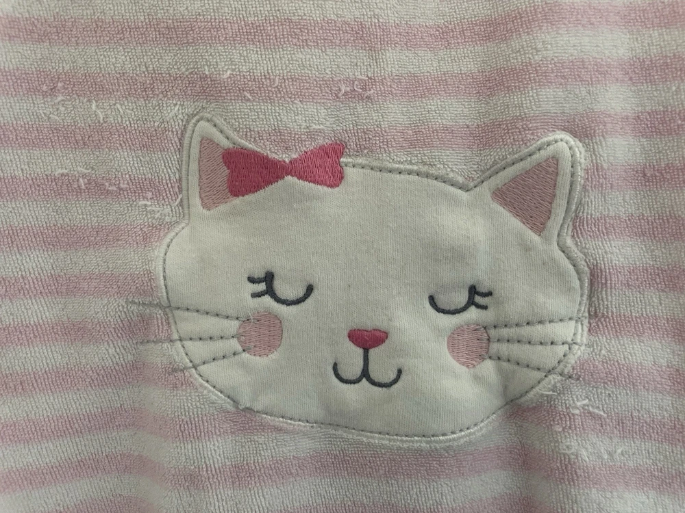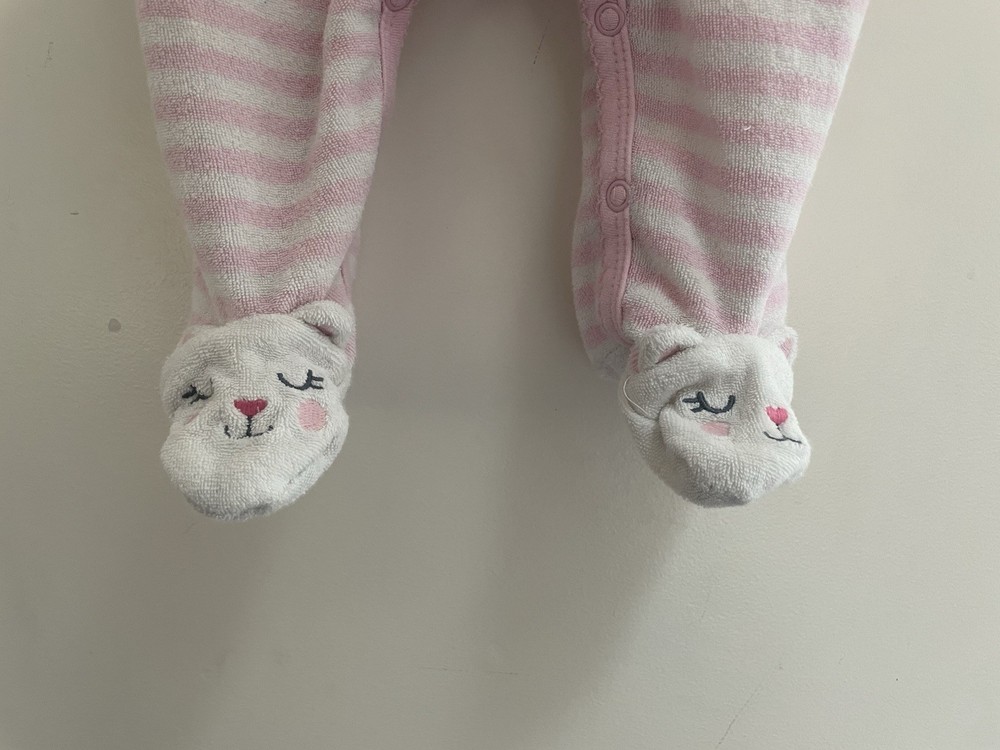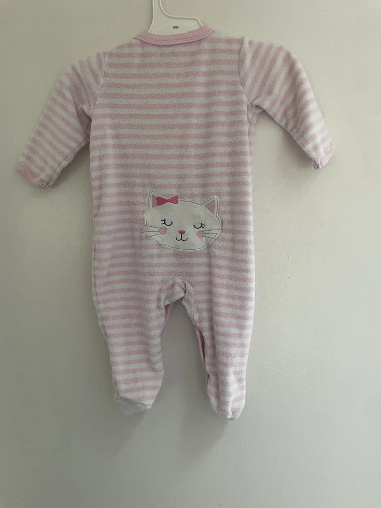 Carter's Baby Girls Cute Cat Applique Striped Terry Snap-Up Sleep & Play Pink 6M. Condition is pre-owned. Smoke free, pet free home. Shipped via USPS Ground Advantage. In good condition. There is a small hole at the seam of the sleeve. Free of stains.