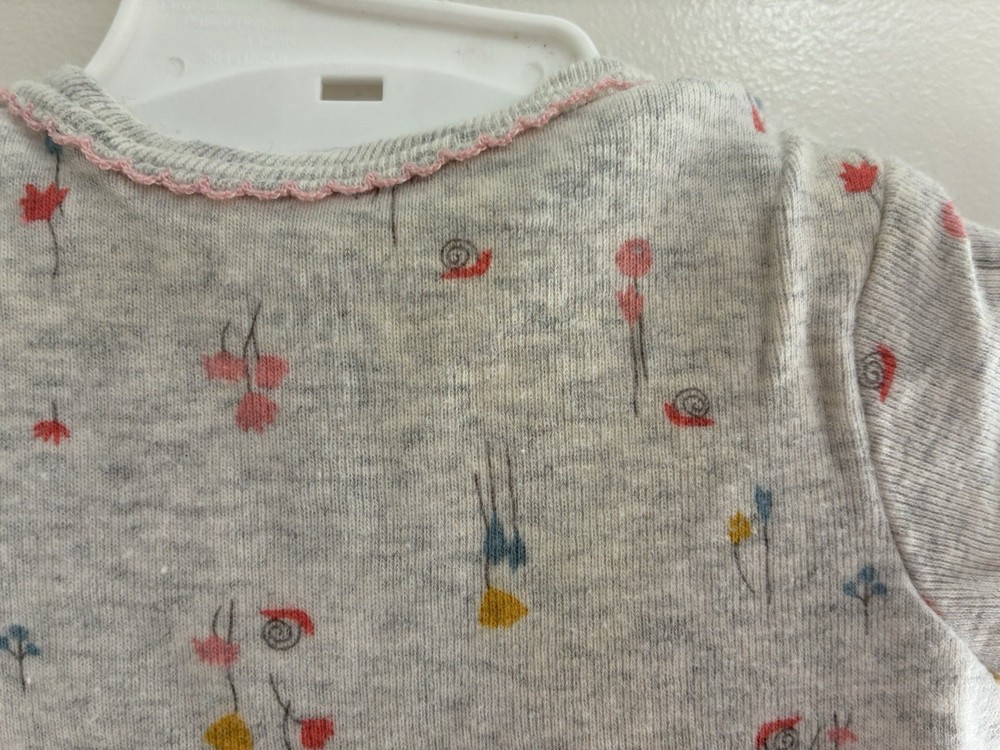 Carter's Baby Girls Floral Bow 100% Cotton Short Sleeve Bodysuit Heather Gray 3M. Condition is pre-owned. Smoke free, pet free home. Shipped via USPS Ground Advantage. In fair condition. There are big, light stains at the top of the bodysuit.
