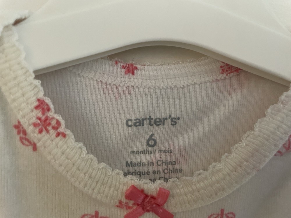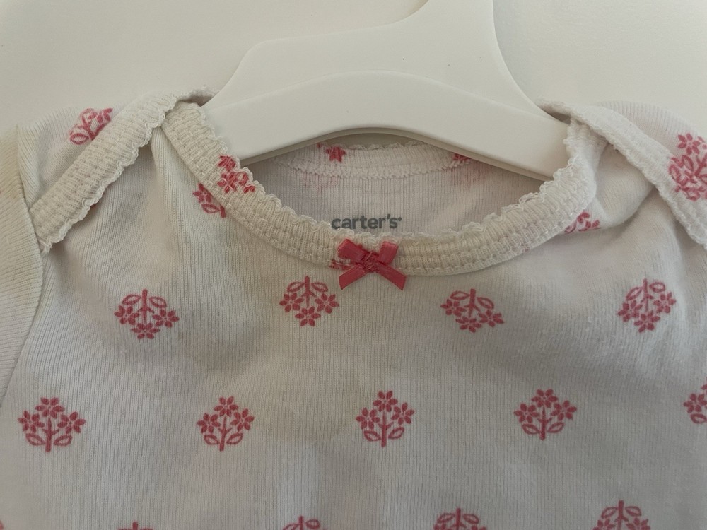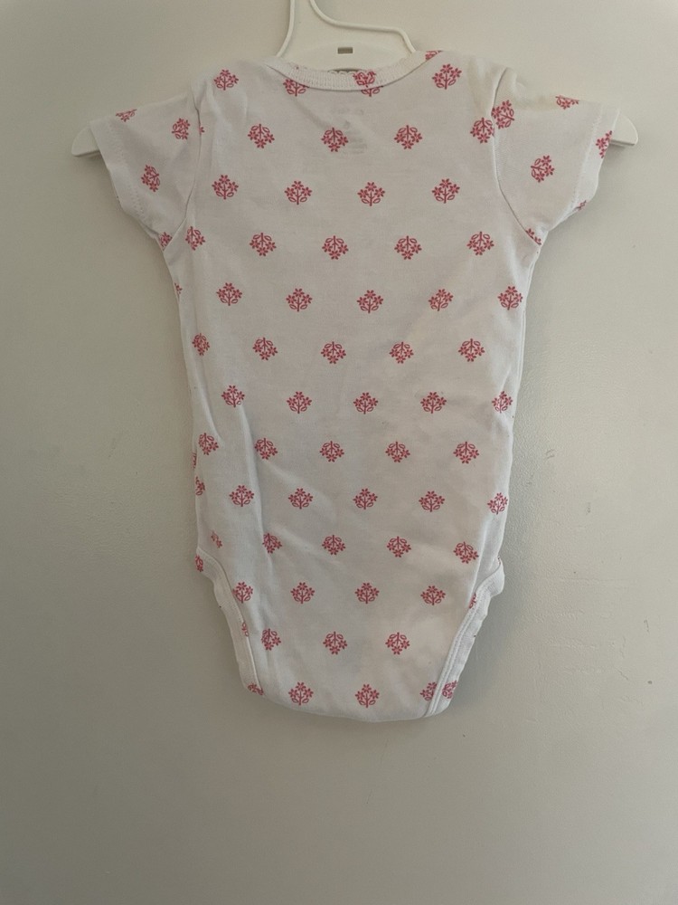 Carter's Baby Girls Floral Pink Bow 100% Cotton Short Sleeve Bodysuit White 6M. Condition is pre-owned. Smoke free, pet free home. Shipped via USPS Ground Advantage. In good condition. There are light stains on the front. Free of rips.