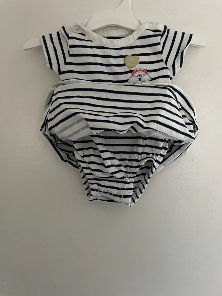 Carter's Baby Girls Rainbow Striped Cotton Short Sleeve Bodysuit Dress Navy 3M. Condition is pre-owned. Smoke free, pet free home. Shipped via USPS Ground Advantage. In very good condition. Free of rips or stains.