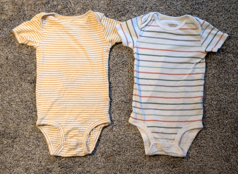 This 4-pack of Carter Based (Carter's, Just One You & Simple Joys) Striped Baby clothes include two 12M Onesies, one Foxy Striped one-piece, and one 12M Striped Onesie. All clothes are washed with wrinkles and NO STAINS.