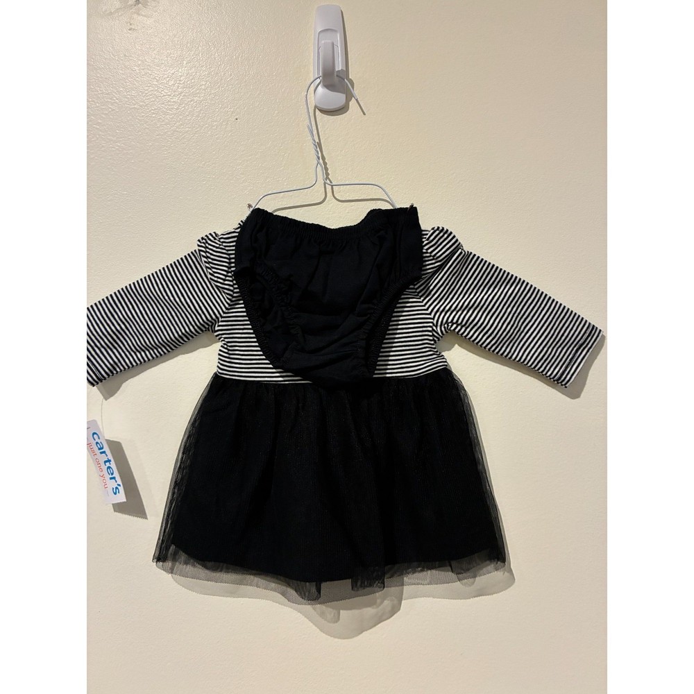 Carters 3m baby girls black and white striped long sleeve dress with a black tulle skirt overlay and a cat applique. This dress includes a matching black diaper cover. Style: Tutu Dress Department: Girls Dress Length: Knee Length Occasion: Casual, Party Character: Grumpy Cat Fabric Type: Jersey Season: Fall Sleeve Length: Long Sleeve Pattern: Striped Material: Fabric Neckline: Round Neck Sleeve Type: Raglan Sleeve Closure: Pullover Theme: Animal Print Features: Graphic Print Keywords: baby girl dress, cat applique, tulle skirt, striped, long sleeve, diaper cover, Halloween, fall, newborn, infant, designer