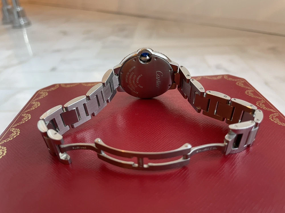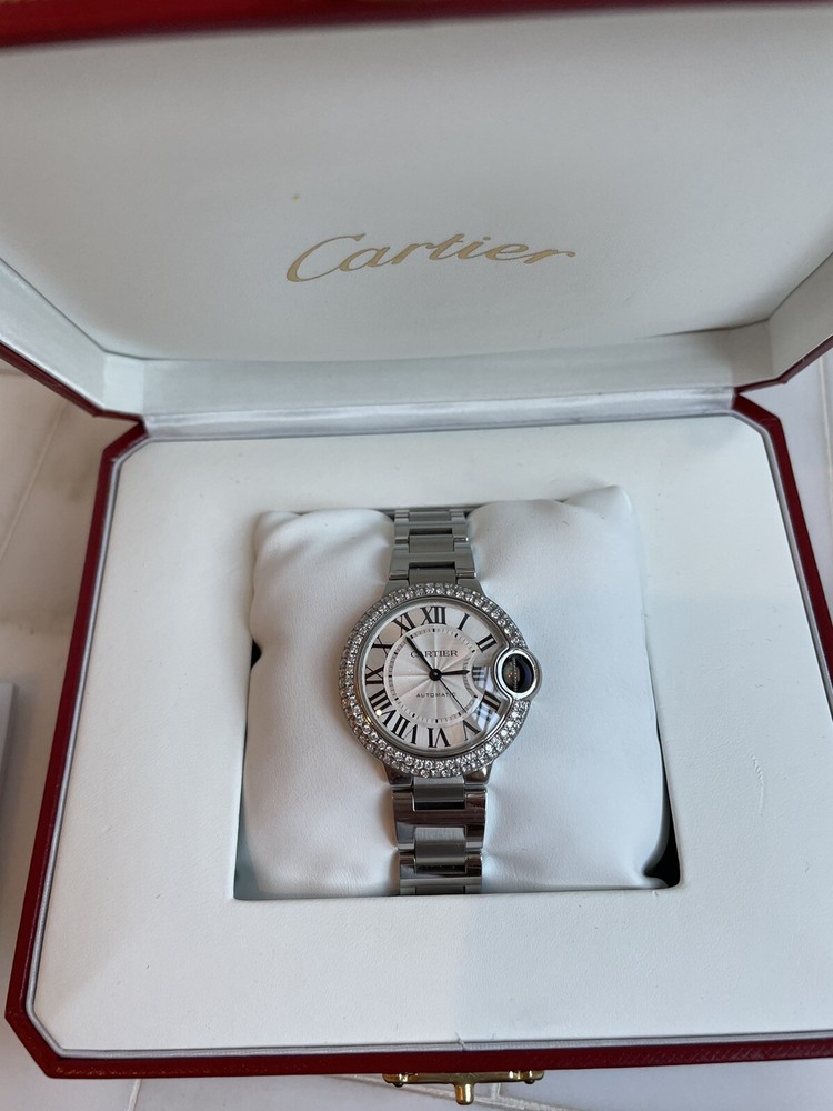 Purchased new through a reputable dealer of Cartier and other high-end timepieces. Lovingly worn for a year and a half and now my wife, a breast cancer survivor, wants to celebrate the end of her treatment journey with a new watch. Selling this to help finance that purchase. The bezel features a double row of professionally-set diamonds. 1.5 tcw, G color, VS clarity diamonds. Includes Cartier box and dated warranty card as pictured. Please contact me with questions or to request additional photos. I am a watch enthusiast and want to be sure I accurately represent its pre-owned condition.