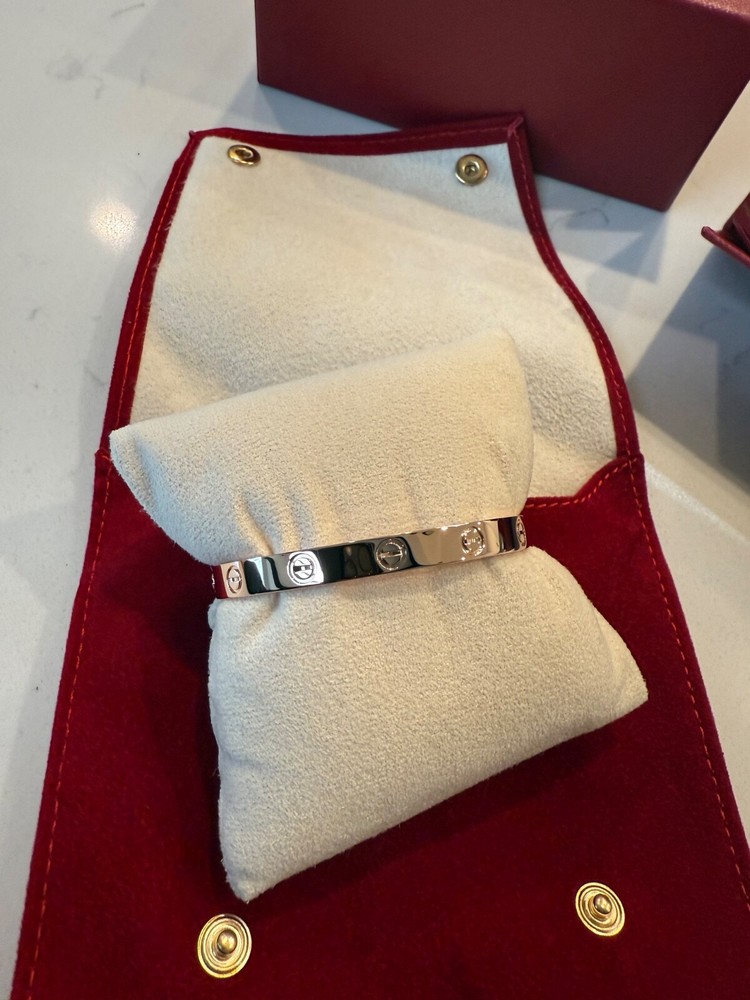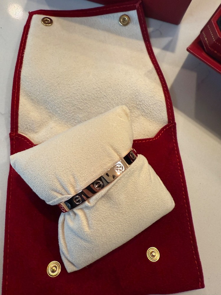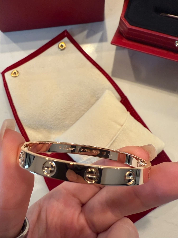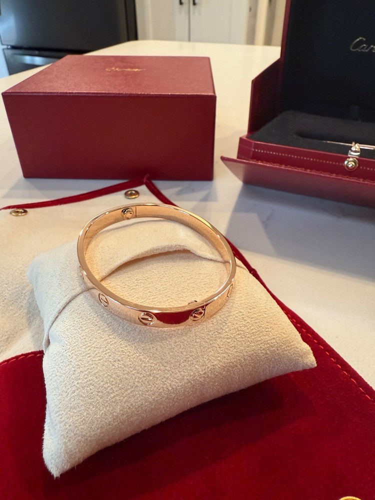Cartier Love Bracelet, Rose Gold, 16cm, Classic Model Pre-owned, recently polished at the Houston boutique and has not been worn since. Looks like new. Purchase comes with box, travel case, original receipt, certificate of authenticity. Retails today for ~$8,000 including tax.