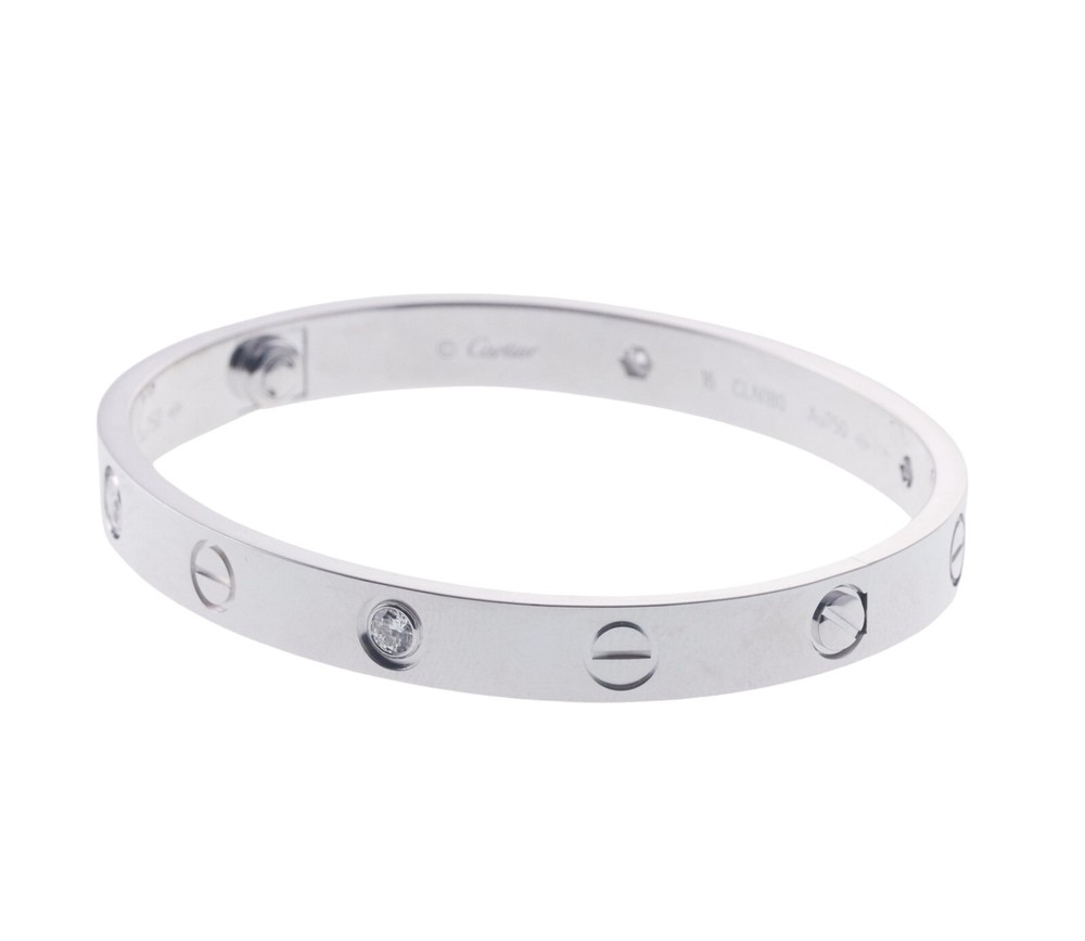 Cartier Love White Gold Diamond Bracelet Size 16 Comes with screw driver, COA and service paper. Retail $12700. MATERIAL 18k White Gold GEMSTONE Diamonds 0.42ctw CLARITY VS COLOR G DIMENSIONS Bracelet is Cartier size 16. MARKED or TESTED Cartier, 750, JCLN***. WEIGHT 30.9 grams StockOOYY8423 ALL ITEMS ARE GUARANTEED AUTHENTIC. ITEMS WILL ONLY BE SHIPPED TO THE ADDRESS SPECIFIED ON THE EBAY ORDER. PAYMENTS MUST BE RECEIVED WITHIN 4 DAYS FROM THE END OF AUCTION. PLEASE ASK QUESTIONS PRIOR TO COMMITTING TO PURCHASE. IF SPECIAL ARRANGEMENTS MUST BE MADE, PLEASE MESSAGE US! WE WILL TRY TO ACCOMMODATE YOU TO THE BEST OF OUR ABILITY.