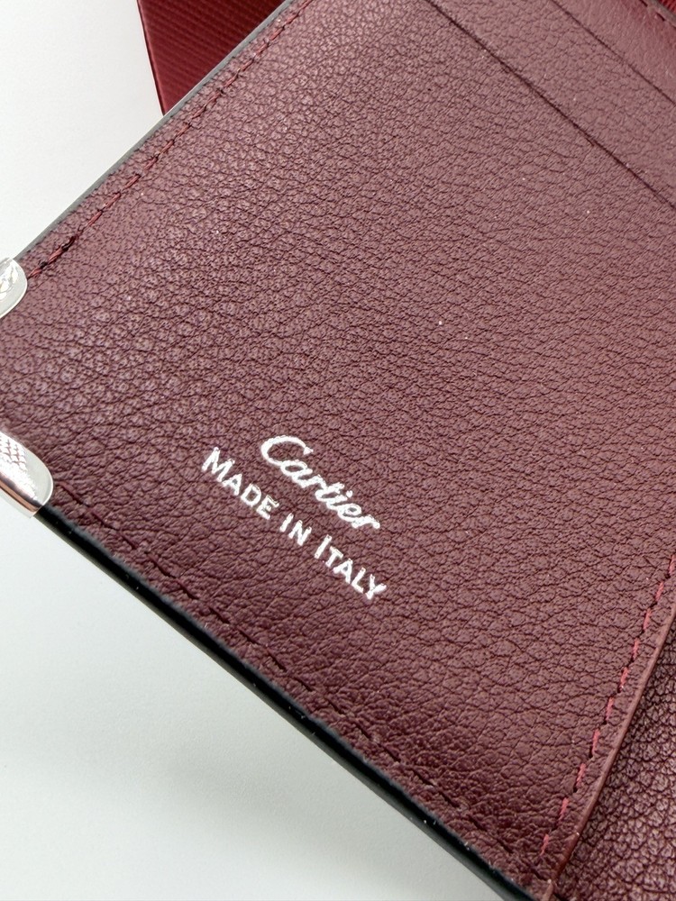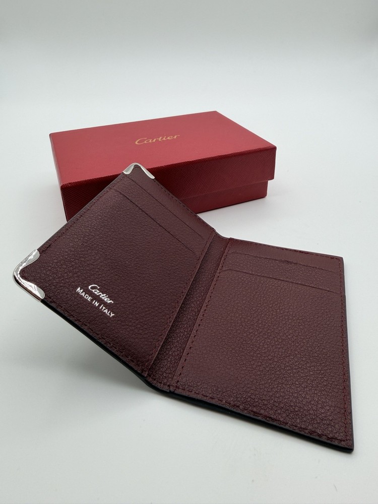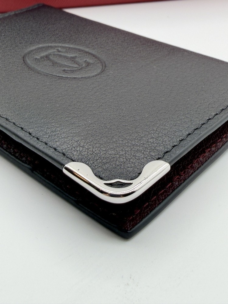 A refined essential from Must de Cartier, this vertical card holder is crafted in luxurious burgundy grained leather and features the iconic Cartier double “C” logo embossed on the front. Accented with elegant silver-tone metal corner guards, it offers a striking blend of heritage style and daily practicality. Details: • Cartier 4-Slot cardholder • Color: Black • Grained calfskin leather exterior and interior • Embossed interlocking Cartier logo on the front • Four interior card slots + one central slip compartment • Rear exterior slip pocket for quick access • Silver-tone corner protectors for a signature finish • Stamped Cartier – Made in Italy • Includes original Cartier box, dust bag, booklet, and care card • Approx. dimensions: 4.3 in x 3 in (11cm x 7.5cm)
