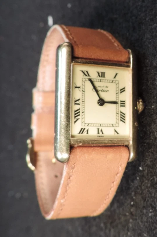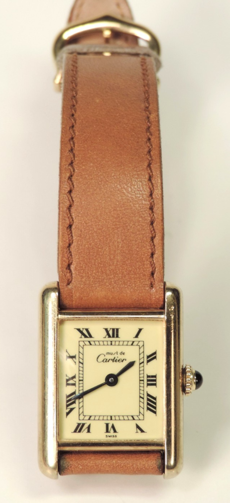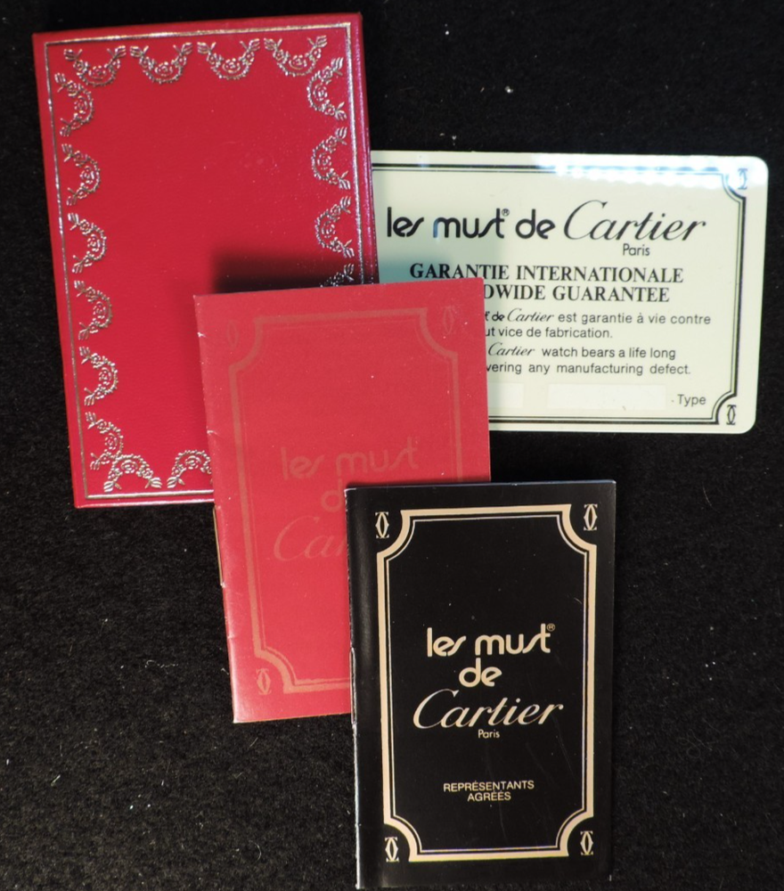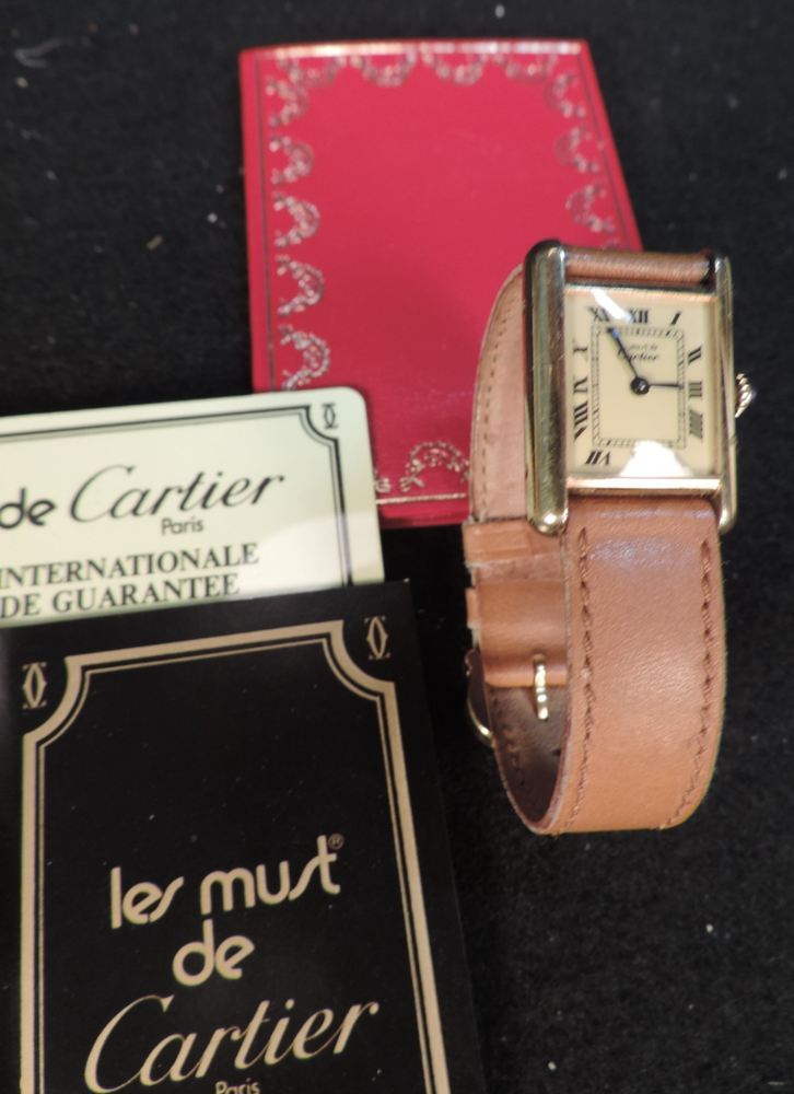 BRAND: CARTIER ITEM: LADIE'S TANK WATCH SERIES: LE MUST DE CARTIER ITEM: WRISTWATCH SIZE: OVERALL CASE MEASUREMENT IS APPROX. 27MM X 20MM MODEL: LES MUST DE CARTIER STYLE: TANK COLORING: CREME FACE BAND: TAN LEATHER INCLUDED: "REPRESENTANTS AGREES" BOOKLET, GUARANTEE, GUARANTEE CARD, CARD CASE (SORRY, NO ORIGINAL BOX) MOVEMENT: MECHANICAL