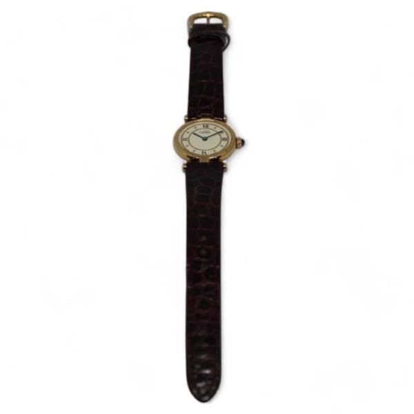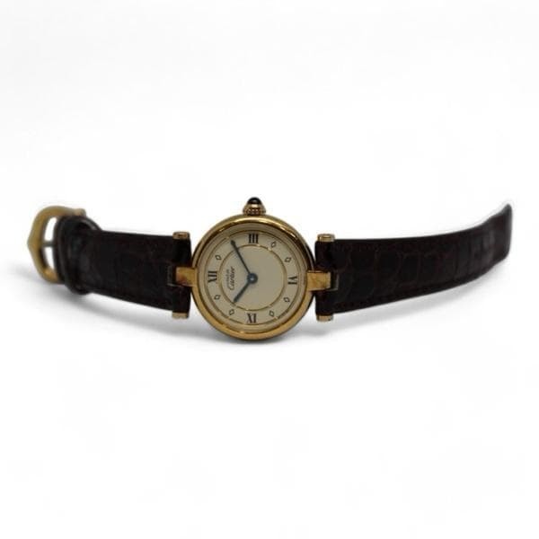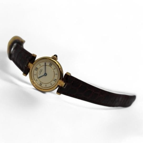 Caseback: NA Seller Warranty: No Case Size: 24 mm Max Wrist Size: NA Customized: No Display: Analog Band Width: NA Watch Shape: Round Case Color: Gold Department: Women Manufacturer Warranty: NA Vintage: Yes Lug Width: 14 mm UPC: Does Not Apply Band Material: Leather Brand: Cartier Indices: NA Year Manufactured: NA Dial Pattern: NA Features: NA Theme: NA With Manual/Booklet: No Case Material: NA Bezel Type: NA, Smooth Handmade: NA With Service Records: No Band/Strap: Two-Piece Strap Type: Wristwatch Model: NA Bezel Color: Gold Escapement Type: NA Seller Notes: “Please see photos and description” Water Resistance: NA Case Finish: Polished Movement: Quartz Dial Color: White With Original Box/Packaging: NA California Prop 65 Warning: NA With Papers: No Style: NA Handedness: NA gtin13: Does Not Apply Closure: NA Number of Jewels: NA Reference Number: NA, 925 Band Color: Brown Country of Origin: Japan Case Thickness: NA