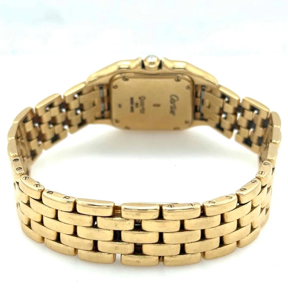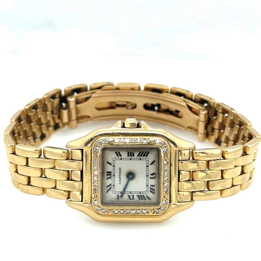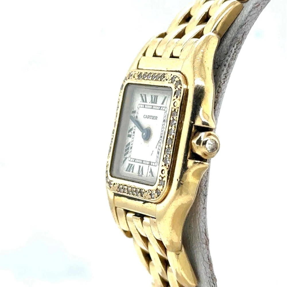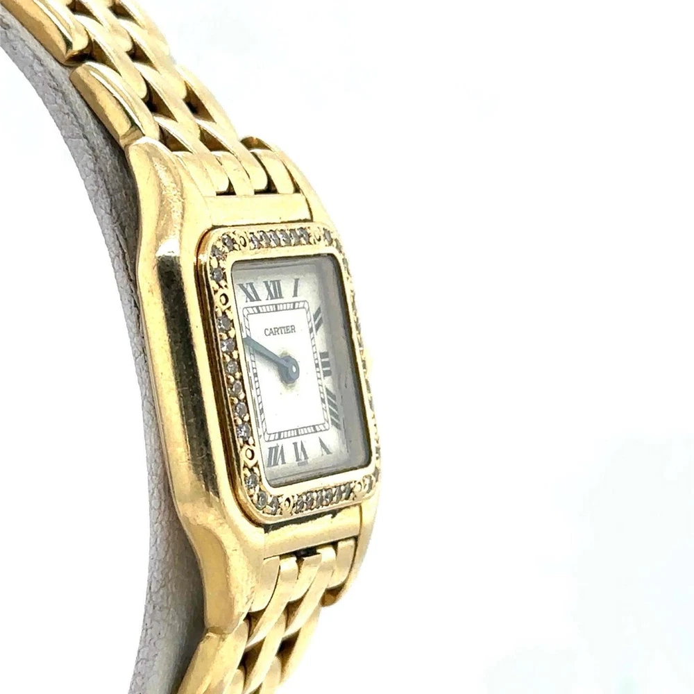 Cartier Panthere Vintage Small Quartz 22mm 18k YellowGold Diamond Bezel WF3070B9 Cartier Panthere Vintage Small Quartz 22mm 18k YellowGold Diamond Bezel WF3070B9 Description 18kt yellow gold case with a 18kt yellow gold bracelet. Fixed gold-tone diamond set bezel. White dial with Roman numeral hour markers. Dial Type: Analog. Quartz movement. Scratch resistant sapphire crystal. Pull / push crown. Transparent case back. Square case shape. Case size: 23 mm. Functions: hour, minute. Luxury watch style. Watch label: Swiss Made. Pre-owned Cartier Panthere White Dial Ladies Watch WF3070B9. General Collection Name Panthere Information Brand Cartier Model WF3070B9 Gender Womens Watch Label Swiss Made Movement Quartz Condition Information Box No Preowned Item Condition Excellent Papers No Comments Cartier Yellow Gold Panthere Diamond Watch Case Case Size 23 mm Case Material 18kt Yellow Gold Case Shape Square Case Back Transparent Dial Type Analog Dial Color White Crystal Scratch Resistant Sapphire Dial Markers Roman Numeral Bezel Fixed Bezel Color Gold-tone Bezel Material Diamond Set Crown Pull / Push Band Band Type Bracelet Band Material 18kt Yellow Gold Features Functions Hour, Minute Watch Features Diamond, Gold, Analog B1096400 300+ Listing Templates! Auctiva gets you noticed! The complete eBay Selling Solution. Track Page Views With Auctiva's Counter