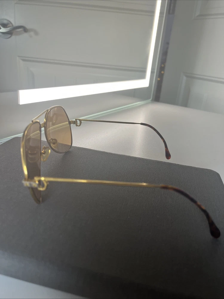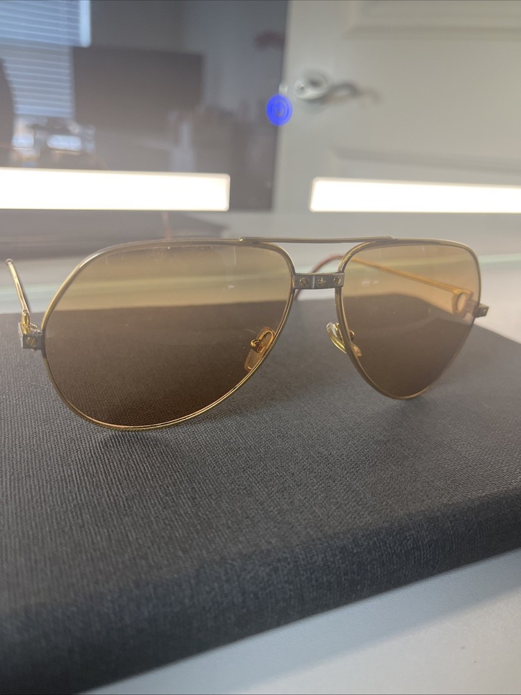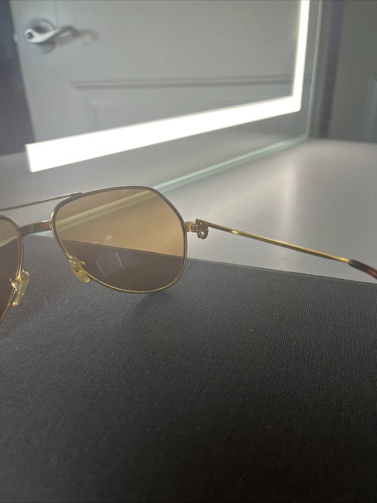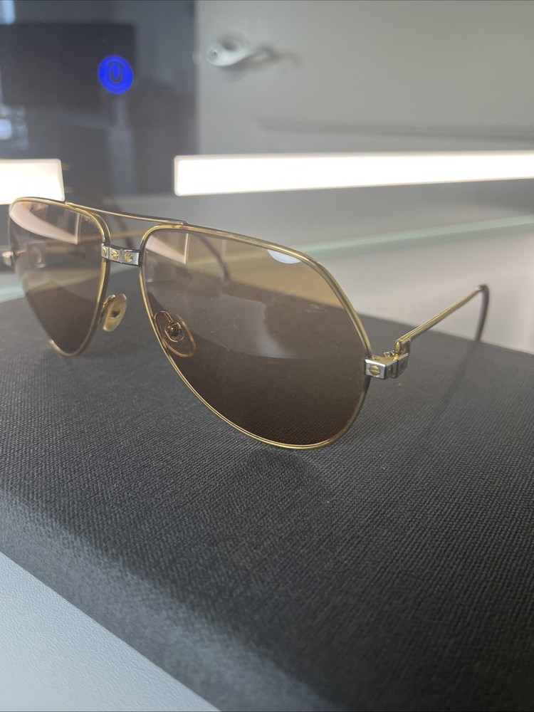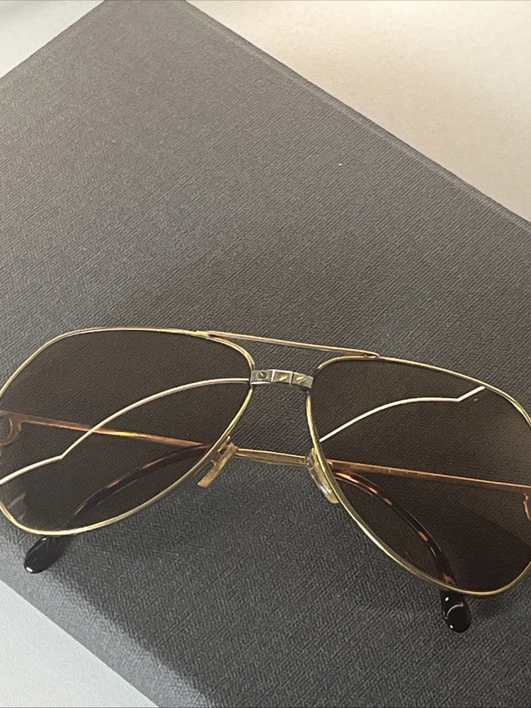 The Cartier Vintage Sunglasses are classic aviator-style sunglasses with a gold metal frame and tinted polycarbonate lenses offering UV400 protection. These timeless sunglasses feature a solid pattern, a magnification strength of 1, and a vintage appeal that makes them a stylish accessory for both men and women. The brand's reputation for quality craftsmanship is reflected in the durable construction and unique design of these sunglasses. Perfect for adding a touch of luxury to any outfit, these Cartier sunglasses are a must-have for anyone looking to make a statement. These Glasses are used and have a little bit os scratches on lenses but other then that there in good shape . No Cartier Box sorry