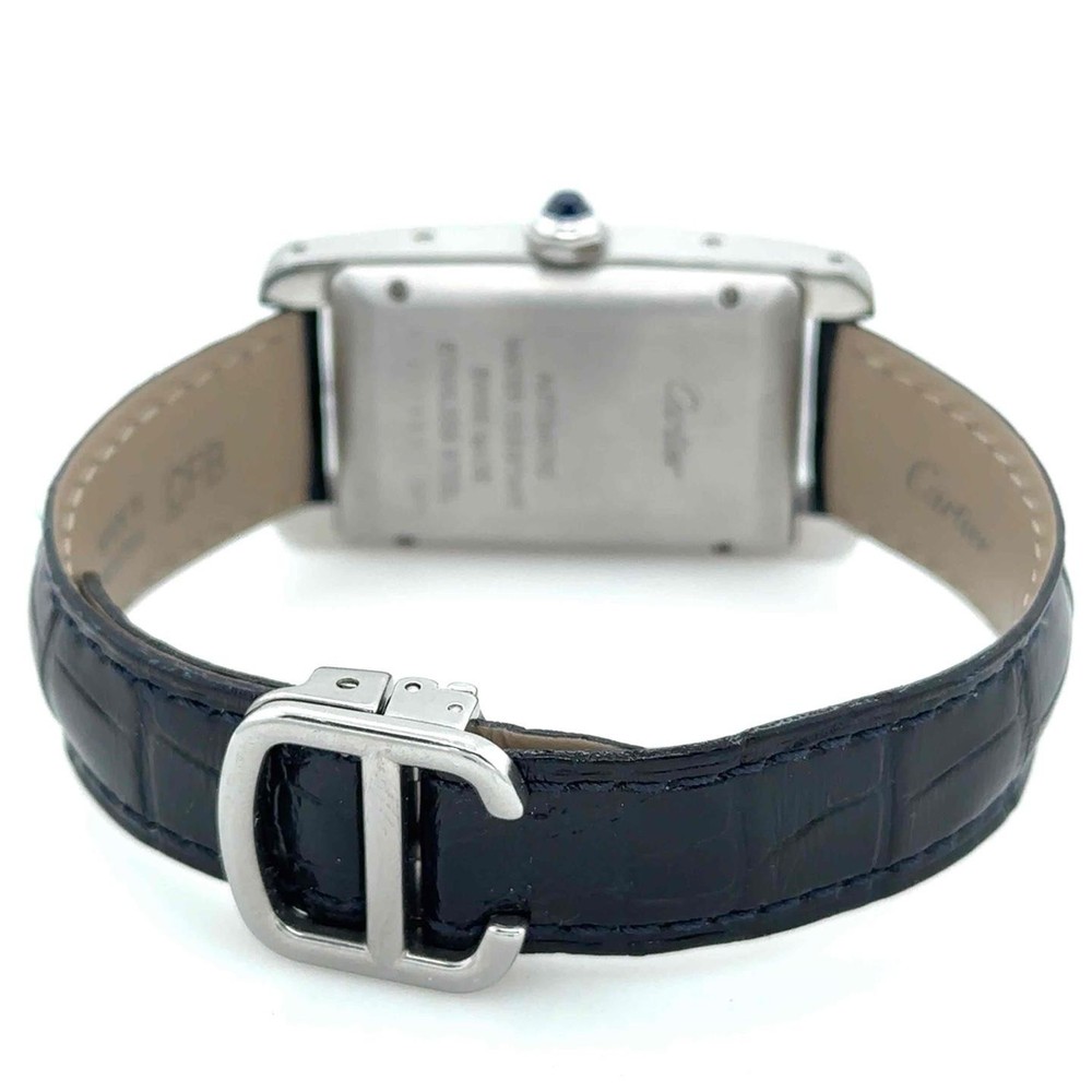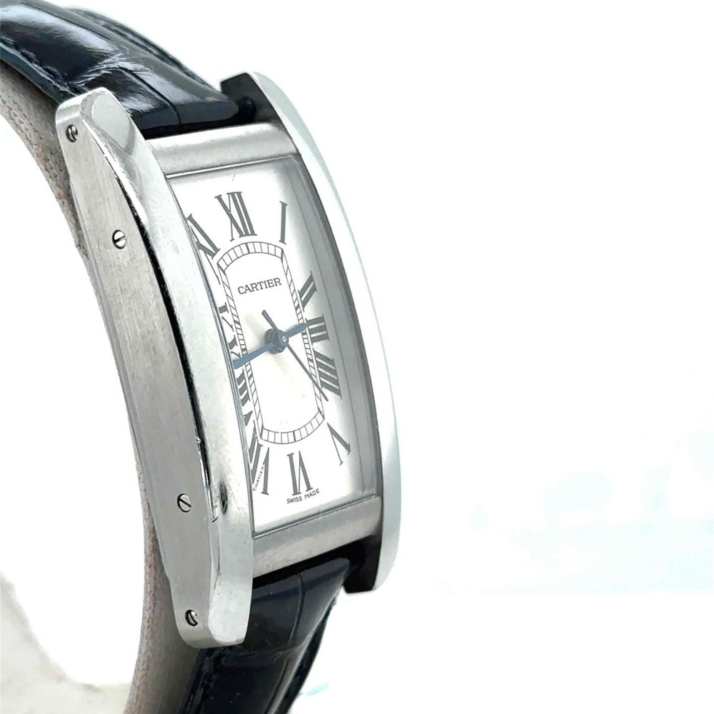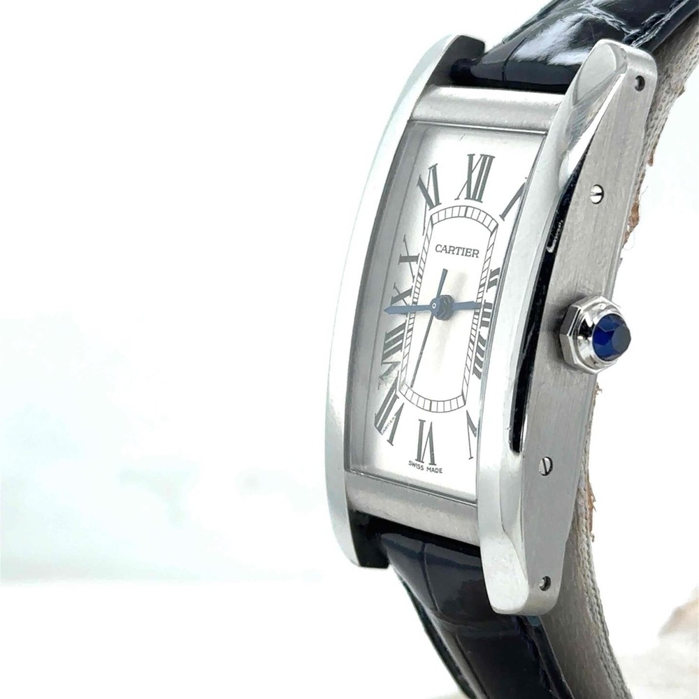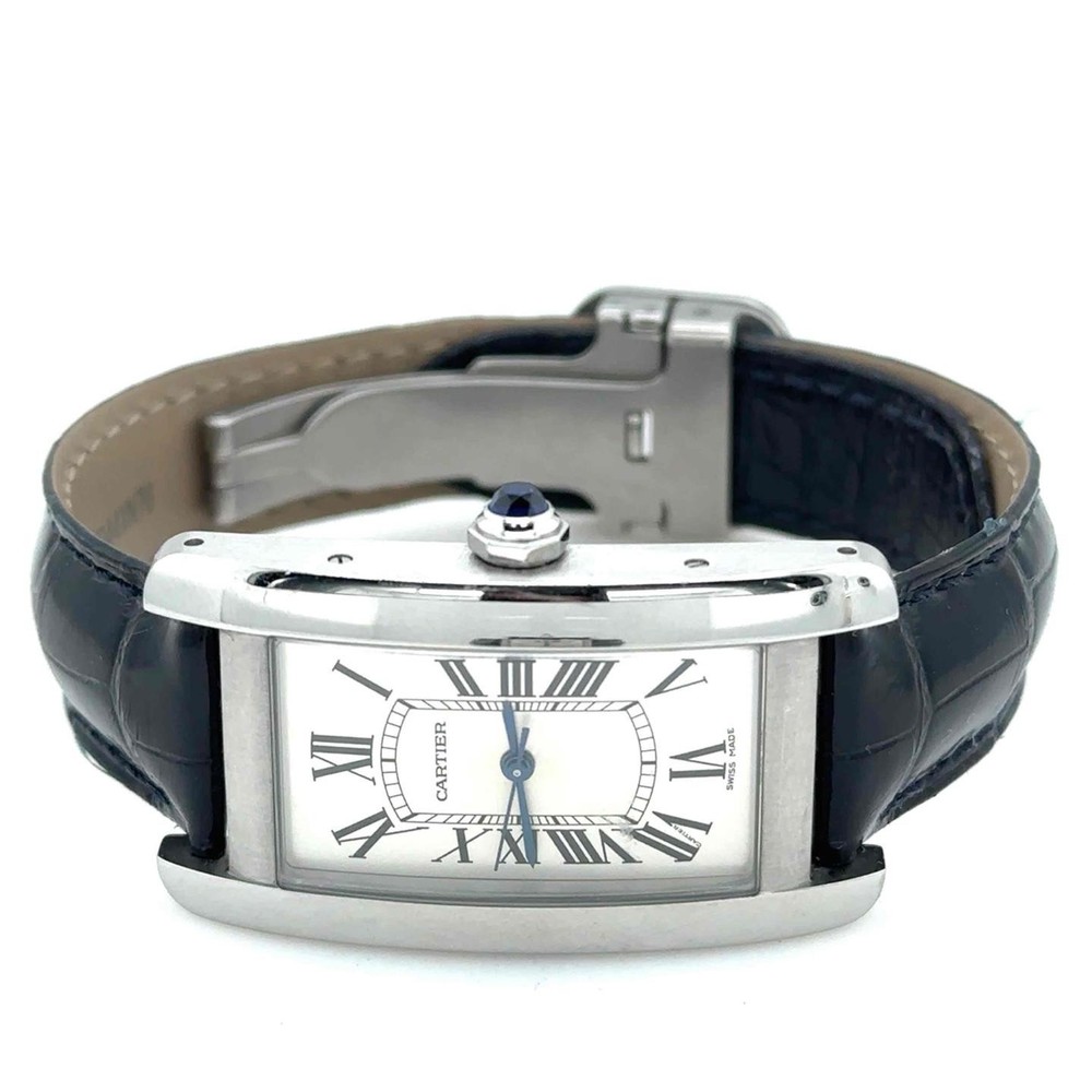 Cartier Tank Americaine Medium Model Automatic Stainless Steel Men's WSTA0017 Cartier Tank Americaine Medium Model Automatic Stainless Steel Men's WSTA0017 Description Stainless steel case with a navy blue (alligator) leather strap. Fixed stainless steel bezel. Silver dial with blued-steel sword-shaped hands and black Roman numeral hour markers. Minute markers around an inner ring. Dial Type: Analog. Automatic movement. Scratch resistant sapphire crystal. Octagonal with a synthetic blue spinel crown. Solid case back. Rectangle case shape. Case dimensions: 41.6 mm x 22.6 mm. Case thickness: 9.5 mm. Band width: 14 mm. Fold over clasp. Water resistant at 30 meters / 100 feet. Functions: hour, minute, second. Tank americaine series. Luxury watch style. Watch label: Swiss Made. Cartier Tank Americaine Automtic Silver Dial Ladies Watch WSTA0017. Product Details General Box Type Original Box Case Case Diameter 41.6 mm x 22.6 mm Case Thickness 9.5 mm Case Material Stainless Steel Case Shape Rectangle Case Back Solid Band Band Material Alligator Leather Band Type Strap Band Color Navy Blue Band Width 14 mm Clasp Fold Over Dial Dial Color Silver Type Analog Crystal Scratch Resistant Sapphire Hands Blued-steel Sword-shaped Dial Markers Black Roman Numeral Second Markers Minute Markers around an inner ring Bezel Fixed Bezel Color Silver-tone Bezel Material Stainless Steel Crown Octagonal with a synthetic blue spinel Information Brand Cartier Collection Name Tank Americaine Gender Womens Model WSTA0017 Watch Label Swiss Made Movement Automatic Features Water Resistance 30 meters / 100 feet Functions Hour, Minute, Second Watch Features Alligator Leather, Analog, Leather, Stainless Steel B333319 300+ Listing Templates! Auctiva gets you noticed! The complete eBay Selling Solution. Track Page Views With Auctiva's Counter