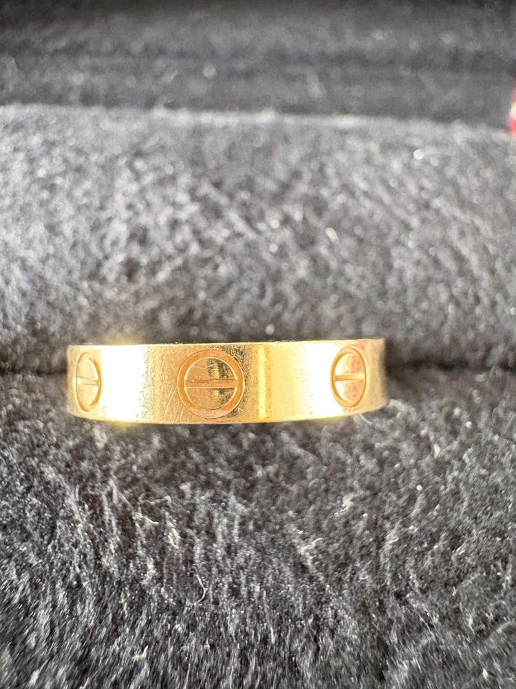 Authentic Cartier Love Ring Size 50 in good condition with regular wear and scratches expected in a pre owned item. Comes with Cartier bag, box, and authenticity certificate. Can share a pic of receipt and the item number if needed. This ring is 3.6mm wide.