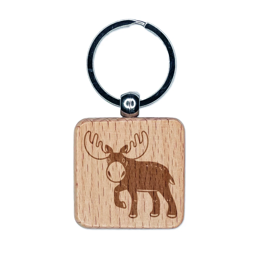 Cartoon Moose Engraved Wood Square Keychain Tag Charm