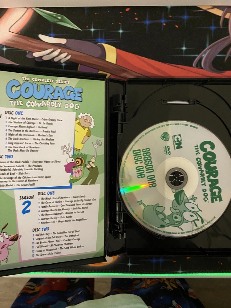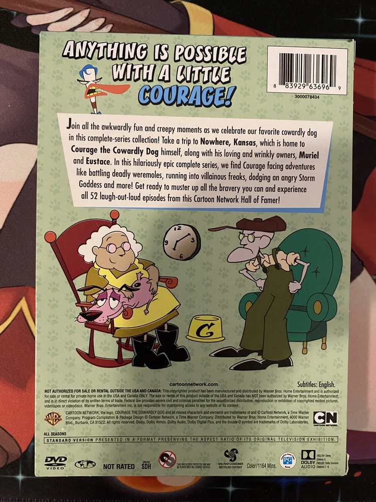 The product is a DVD box set of the complete series of "Courage the Cowardly Dog" from Cartoon Network. It includes Season 1 with a total run time of 1144 minutes. The TV animation series is in English and is part of the Cartoon Network Hall of Fame collection.