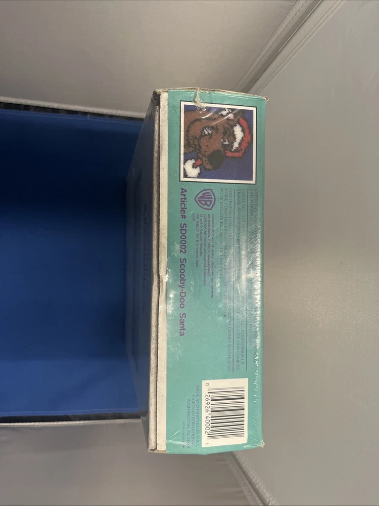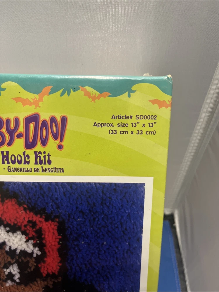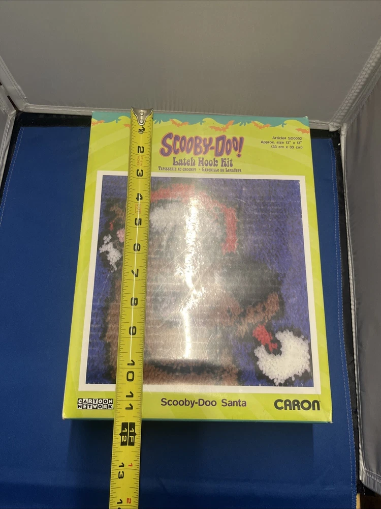 The product is a Caron latch hook kit featuring Cartoon Network's Scooby Doo dressed as Santa. The kit includes all necessary materials to create a 13x13-inch latch hook rug with a Christmas theme. It is new and sealed. Made in the United States. Storage unit fine thank you for viewing.