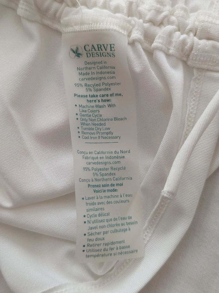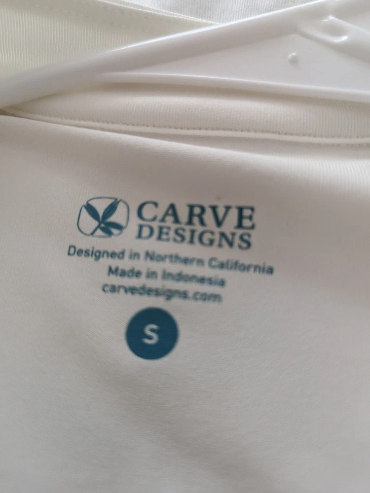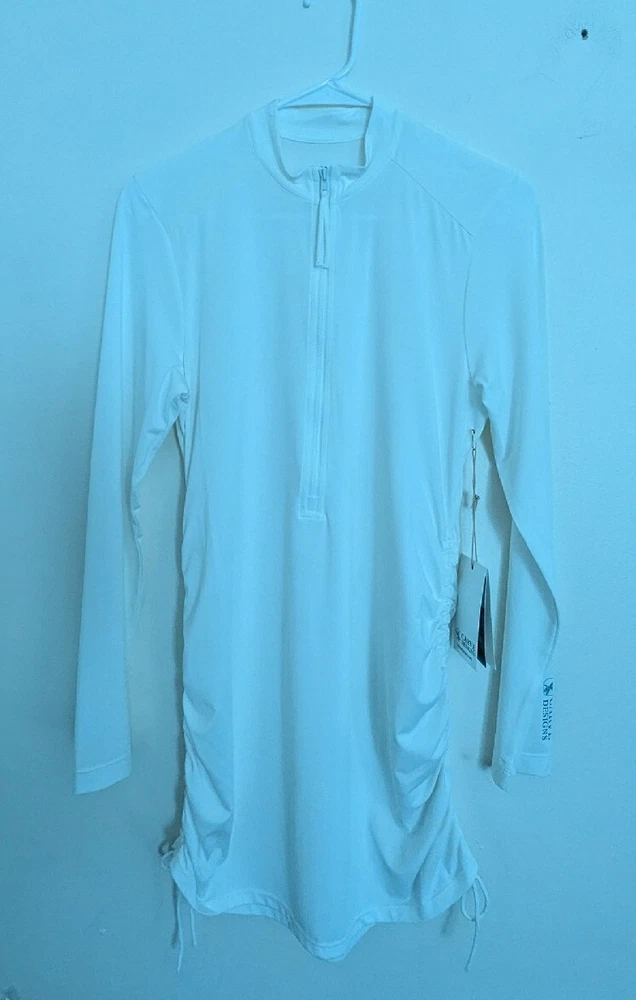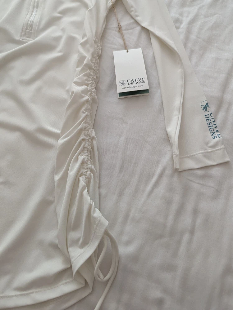 This Carve Designs rashguard top is perfect for women who want to stay safe while they enjoy the beach or surf. The top comes in a size small, with a solid white color and a half-zip design. It is made from a combination of recycled polyester and spandex, and features ruched sides and a Carve Designs logo on sleeve accent. The shirt is designed with a swim shirt style, and has long sleeves for added comfort. It is recommended to hand wash the shirt only. The top is perfect for those who want a designer, yet stylish and functional piece of clothing. It is suitable for sports and other beach activities. Measurements in photos