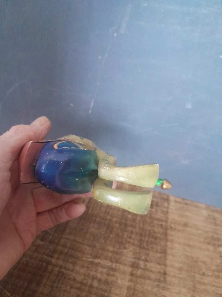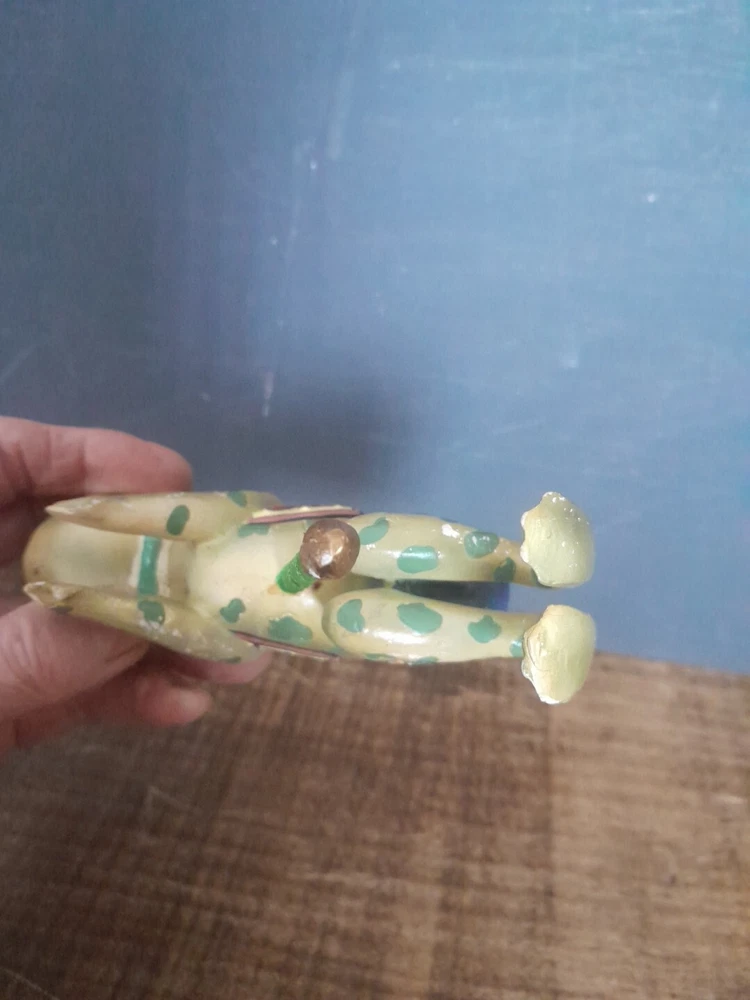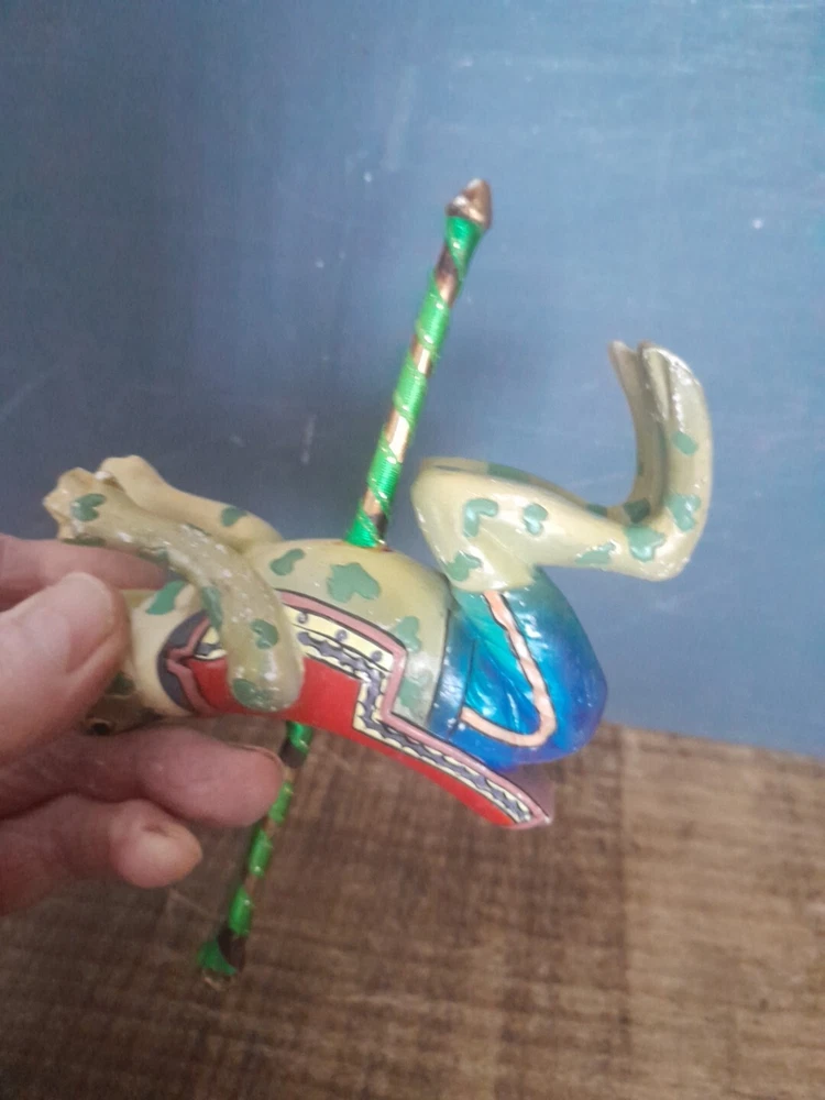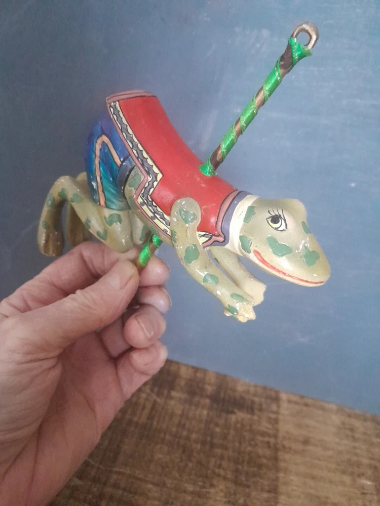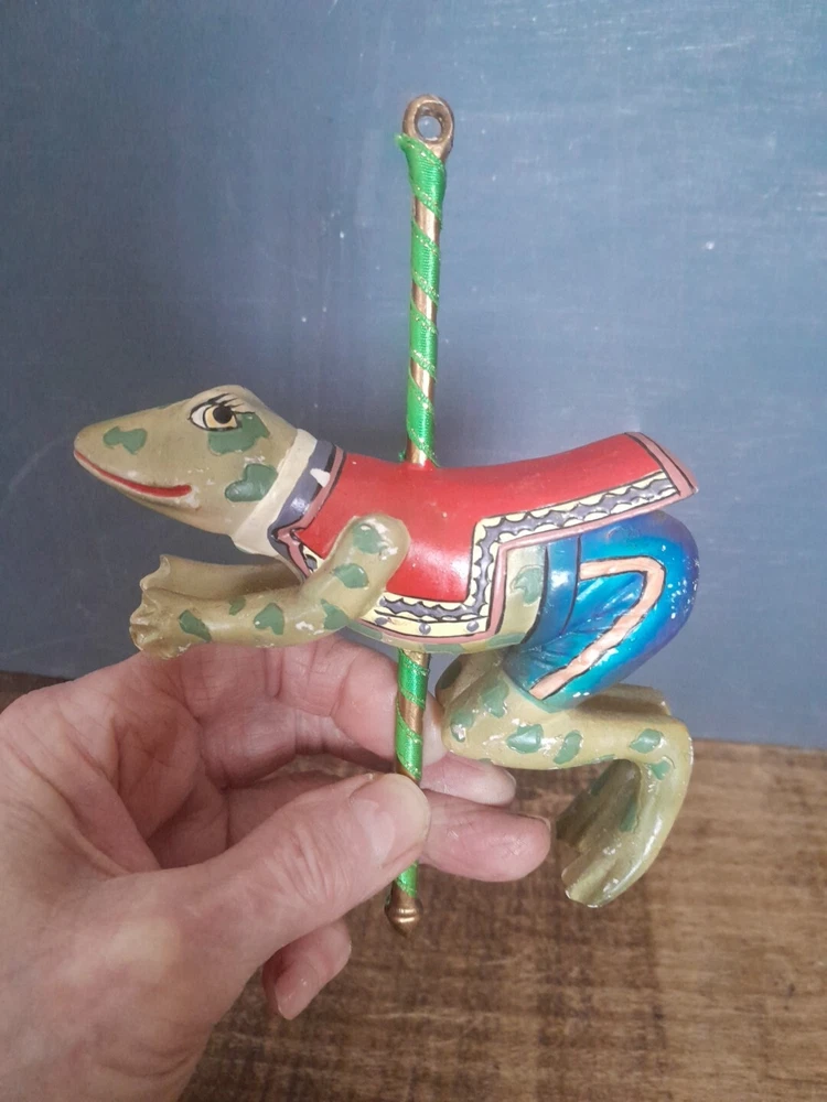 The Kurt Adler ornament is a vintage hand-painted wooden and resin carousel ornament featuring a frog design from The Smithsonian Institution collection. It is a unique addition to any Christmas ornament collection. Very minor wear on paint wear from age please see pictures for part of description and measurements any questions please ask thank you