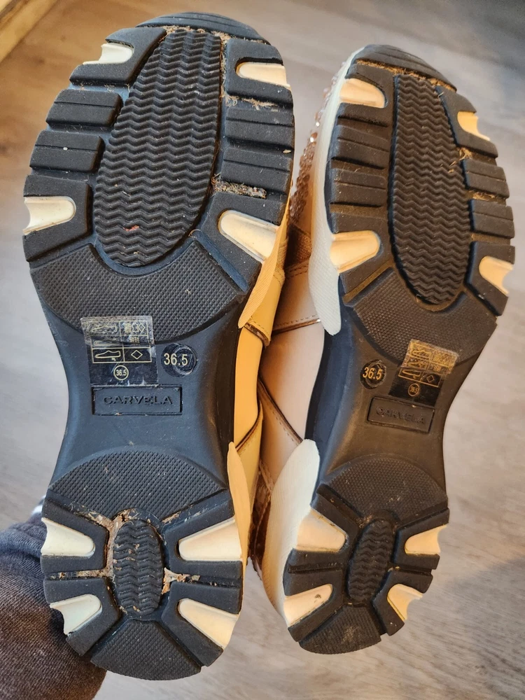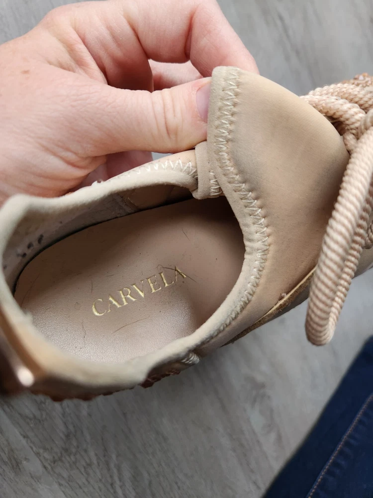 Step up your shoe game with these gorgeous Carvela rose gold sneakers! These stunners are perfect for a day out on the town or hitting the club with your friends. The metal cleats give them an athletic edge, while the studded accents add a touch of punk rock flair. Some wear and tare see pictures