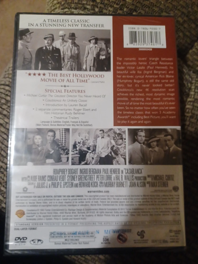 Release Year: 2012 Genre: Classical gtin13: 0883929374618 Actor: Humphrey Bogart, Ingrid Bergman, Paul Henreid, Claude R Studio: Warner Home Video Director: Michael Curtiz Features: Commentary Run Time: 102 MIN. Country/Region of Manufacture: United States Movie/TV Title: Casablanca Language: English Case Type: Tall/DVD Case Type: Movie Rating: PG Edition: Remastered Sub-Genre: Family, Music Video Format: NTSC Producer: Hal B, Wallis Subtitle Language: English Region Code: DVD: 1 (US, Canada...) Format: DVD MPN: 3000053428 UPC: 0883929374618 Music Artist: Max Steiner