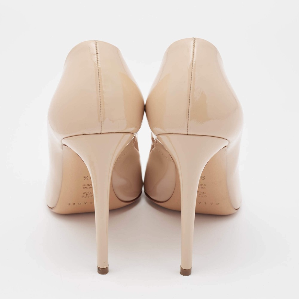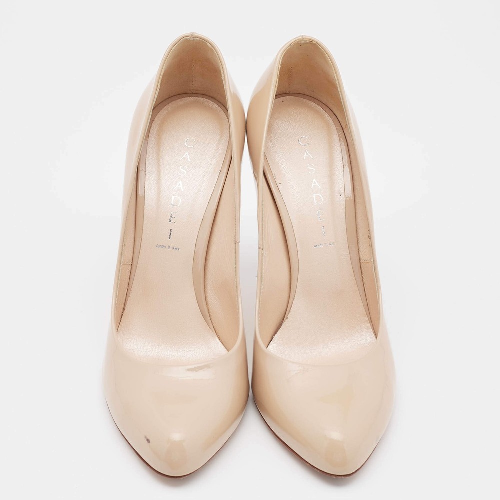 Our eBay Store About Us Contact Us Add to Favorite Sellers Casadei Beige Patent Leather Pointed Toe Pumps Size 395 Curvaceous arches, a feminine appeal, and a well-built structure define this set of designer pumps. Coming with comfortable insoles and sleek heels, style them with your favorite outfits. Product Details Brand Casadei Color Beige Includes The Luxury Closet Packaging Outsole Length 23 cm Outsole Width 8 cm Size US 9.5 (EU 39.5/UK 6.5) Certified by The Luxury Closet This item has gone through a detailed authentication process overseen by our experts. We offer a lifetime guarantee of authenticity on all our items. How We Check The in-house team of experts at The Luxury Closet is highly trained to verify the authenticity and the condition of the luxury products. They ensure that only 100% authentic items are put on sale.The evaluation process is unique with its own mix of assessment criteria and differs according to the category. Each item is evaluated based on the following combination of hallmarks, hardware, stitching, symmetry, material, craftsmanship, stamping, codes, hologram stickers, and packaging. Our authenticators also check if the items have been modified or amended (e.g., aftermarket diamonds, replaced batteries, repaired bags, etc.) International Buyers Import duties, taxes and charges are not included in the item price. These charges are the buyers responsibility. Please check with your country’s customs office to determine what these additional cost will be prior to buying.