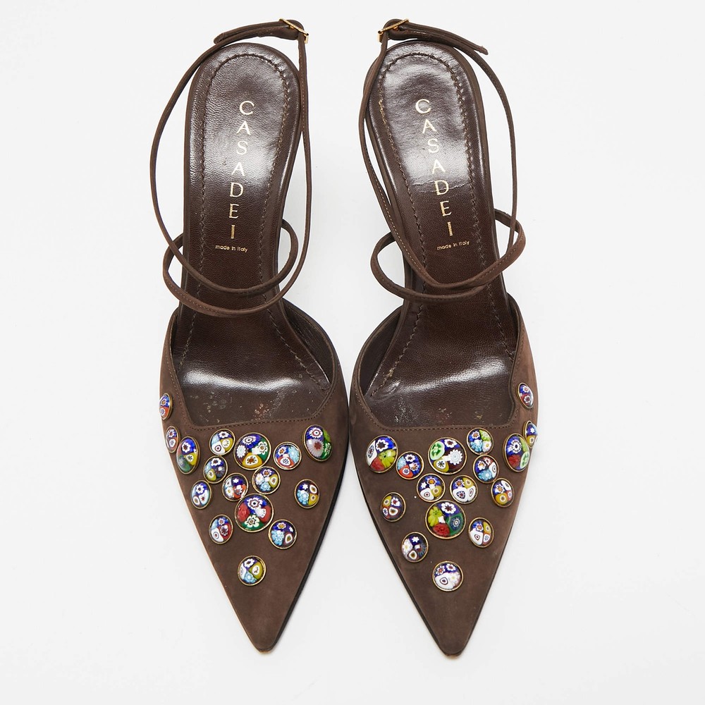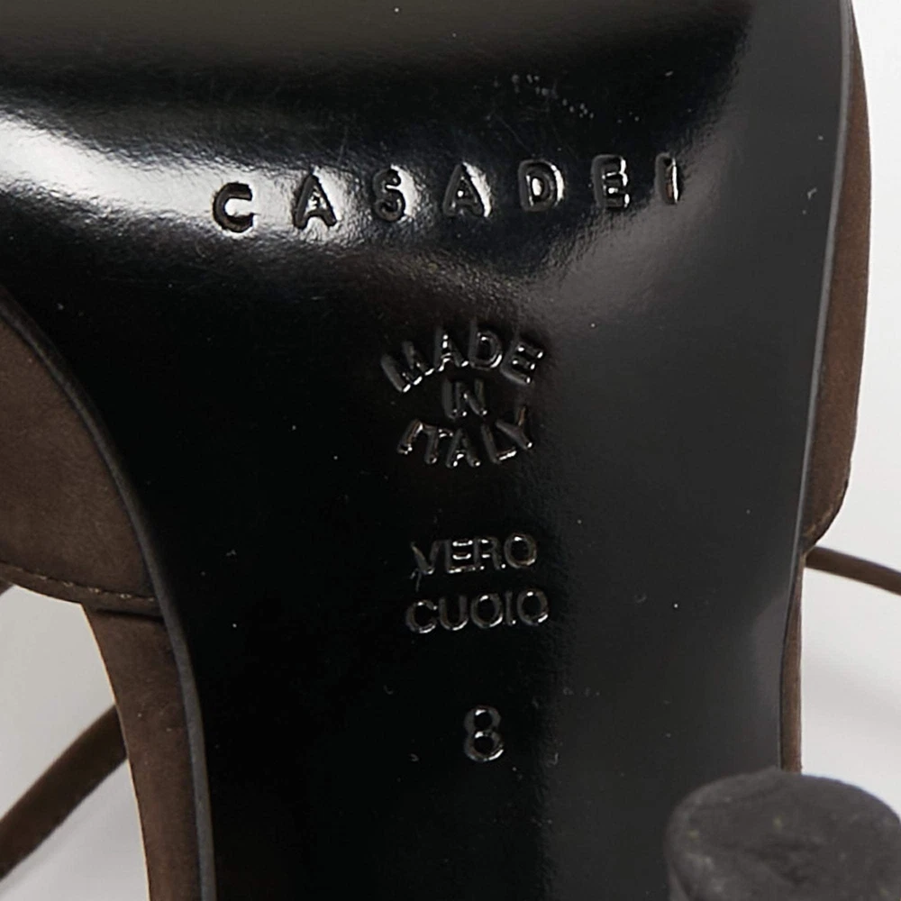 Our eBay Store About Us Contact Us Add to Favorite Sellers Casadei Dark Brown Nubuck Leather Pointed Toe Ankle Wrap Sandals Size 38 Gorgeous details and an understated elegance crowns these Casadei sandals. The dark brown nubuck leather construction brings to life a pointed-toe silhouette that is enhanced by chic motifs on vamps and buckled ankle wraps. Set on 11cm heels, these beauties will offer you a comfortable walk with their leather-lined insoles. They'll match well with a lot of outfits! Product Details Brand Casadei Color Brown Includes Original Dustbag Outsole Length 26 cm Outsole Width 8 cm Size US 8 (EU 38/UK 5) Certified by The Luxury Closet This item has gone through a detailed authentication process overseen by our experts. We offer a lifetime guarantee of authenticity on all our items. How We Check The in-house team of experts at The Luxury Closet is highly trained to verify the authenticity and the condition of the luxury products. They ensure that only 100% authentic items are put on sale.The evaluation process is unique with its own mix of assessment criteria and differs according to the category. Each item is evaluated based on the following combination of hallmarks, hardware, stitching, symmetry, material, craftsmanship, stamping, codes, hologram stickers, and packaging. Our authenticators also check if the items have been modified or amended (e.g., aftermarket diamonds, replaced batteries, repaired bags, etc.) International Buyers Import duties, taxes and charges are not included in the item price. These charges are the buyers responsibility. Please check with your country’s customs office to determine what these additional cost will be prior to buying.