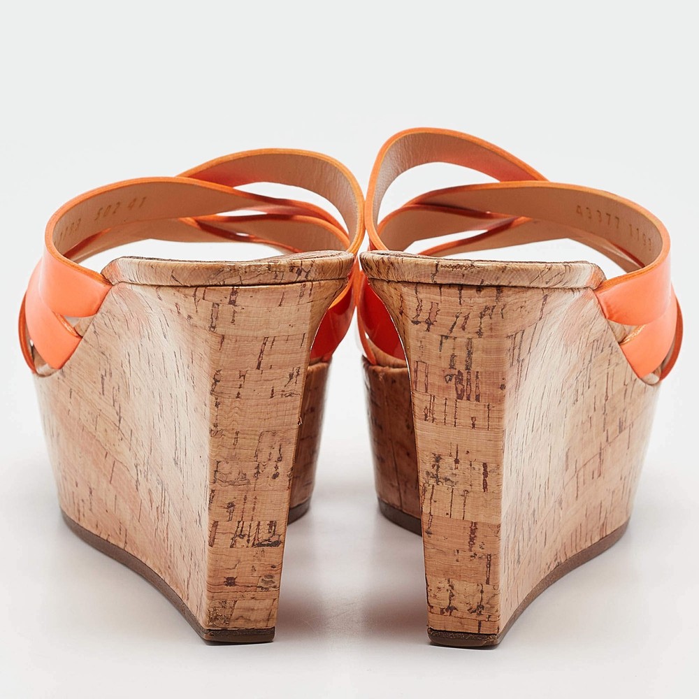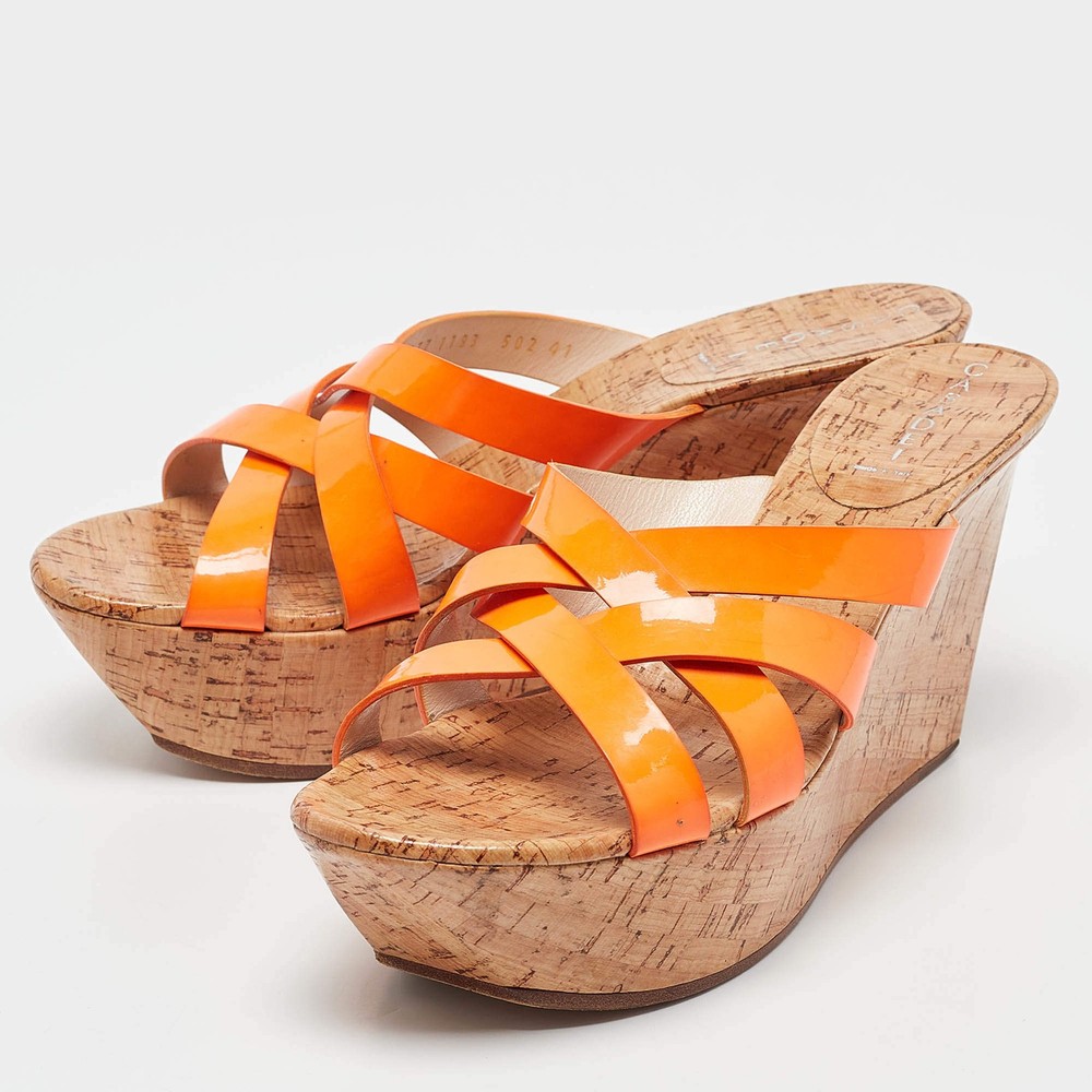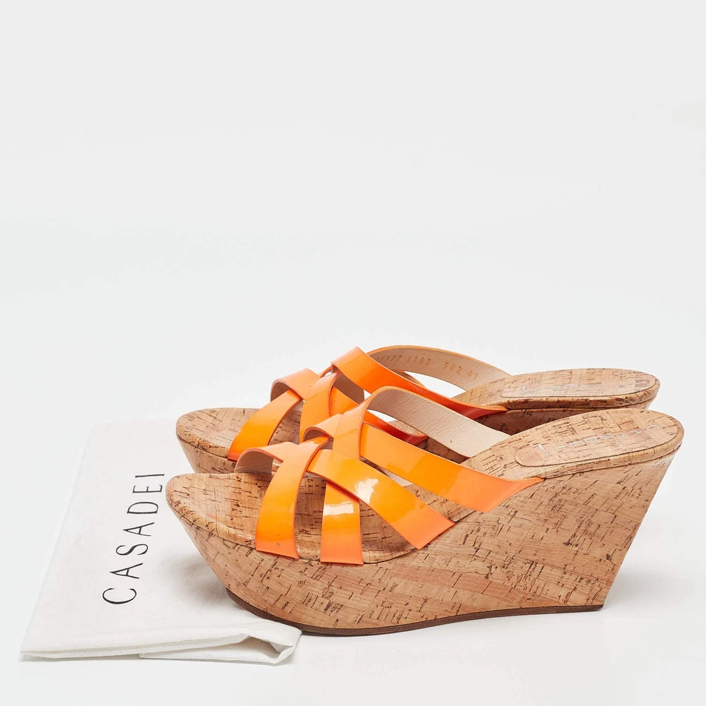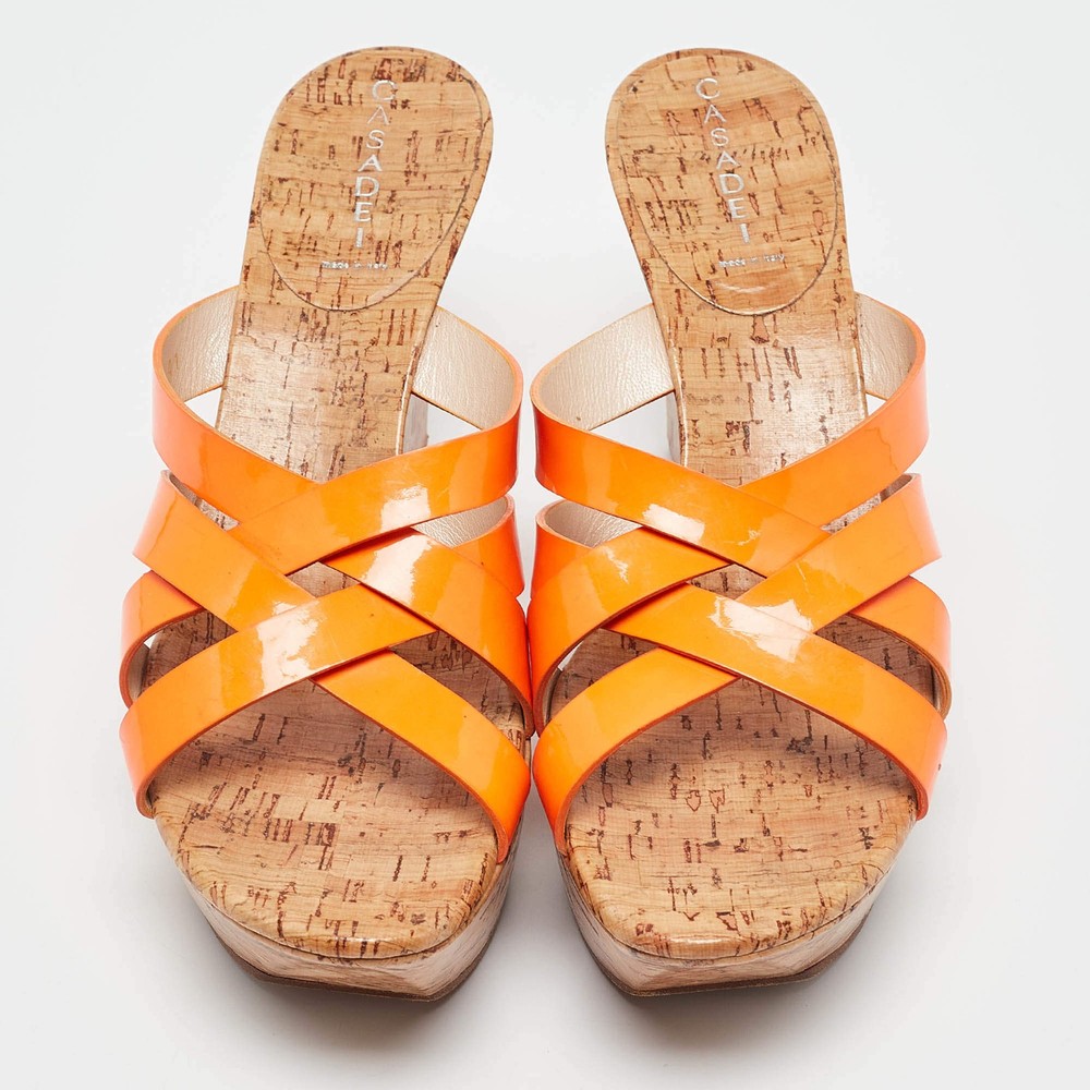 Our eBay Store About Us Contact Us Add to Favorite Sellers Casadei Orange Patent Leather Cork Platform Wedge Slide Sandals Size 41 These orange sandals from Casadei are ultra-feminine and spell unapologetic glamour. These stunning sandals are crafted from patent leather and feature an open-toe silhouette. They flaunt a strappy design on the vamps and smooth insoles. The 10cm cork wedge heels look absolutely amazing and provide the utmost comfort. Product Details Brand Casadei Color Orange Includes Original Dustbag Outsole Length 22 cm Outsole Width 7 cm Size 41 Certified by The Luxury Closet This item has gone through a detailed authentication process overseen by our experts. We offer a lifetime guarantee of authenticity on all our items. How We Check The in-house team of experts at The Luxury Closet is highly trained to verify the authenticity and the condition of the luxury products. They ensure that only 100% authentic items are put on sale.The evaluation process is unique with its own mix of assessment criteria and differs according to the category. Each item is evaluated based on the following combination of hallmarks, hardware, stitching, symmetry, material, craftsmanship, stamping, codes, hologram stickers, and packaging. Our authenticators also check if the items have been modified or amended (e.g., aftermarket diamonds, replaced batteries, repaired bags, etc.) International Buyers Import duties, taxes and charges are not included in the item price. These charges are the buyers responsibility. Please check with your country’s customs office to determine what these additional cost will be prior to buying.