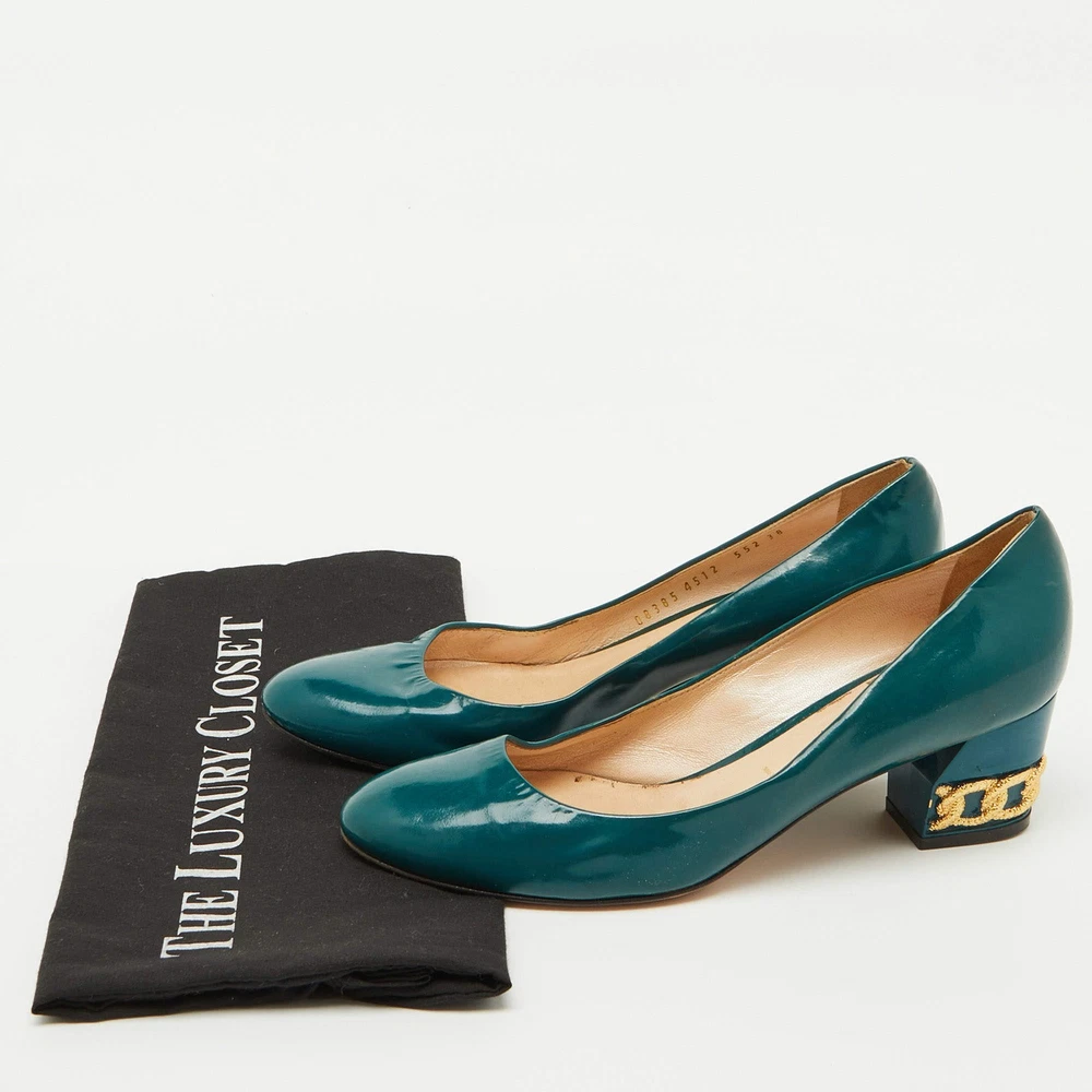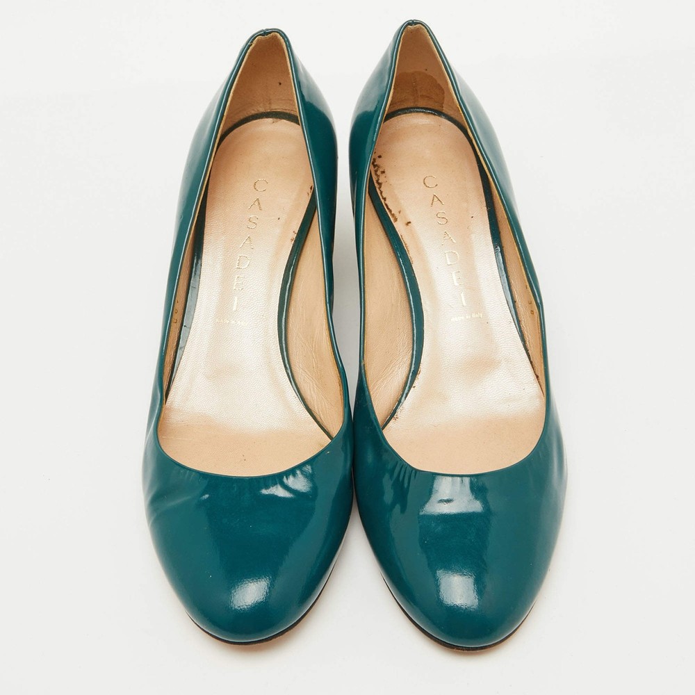 Our eBay Store About Us Contact Us Add to Favorite Sellers Casadei Teal Green Patent Leather Chain Block Heel Round Toe Pumps Size 38 These Casadei pumps are a great choice if you’re looking to add a pair that's both classy and bold. The pair has been made in Italy from green patent leather and set on chain-embellished block heels. Product Details Brand Casadei Color Green Includes The Luxury Closet Packaging Outsole Length 25 cm Outsole Width 8 cm Size US 8 (EU 38/UK 5) Certified by The Luxury Closet This item has gone through a detailed authentication process overseen by our experts. We offer a lifetime guarantee of authenticity on all our items. How We Check The in-house team of experts at The Luxury Closet is highly trained to verify the authenticity and the condition of the luxury products. They ensure that only 100% authentic items are put on sale.The evaluation process is unique with its own mix of assessment criteria and differs according to the category. Each item is evaluated based on the following combination of hallmarks, hardware, stitching, symmetry, material, craftsmanship, stamping, codes, hologram stickers, and packaging. Our authenticators also check if the items have been modified or amended (e.g., aftermarket diamonds, replaced batteries, repaired bags, etc.) International Buyers Import duties, taxes and charges are not included in the item price. These charges are the buyers responsibility. Please check with your country’s customs office to determine what these additional cost will be prior to buying.