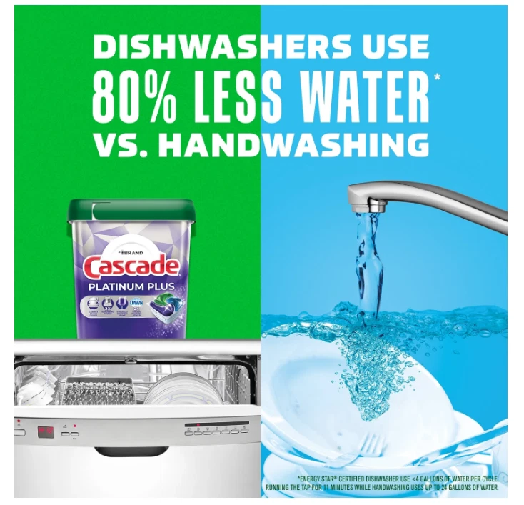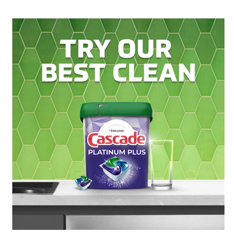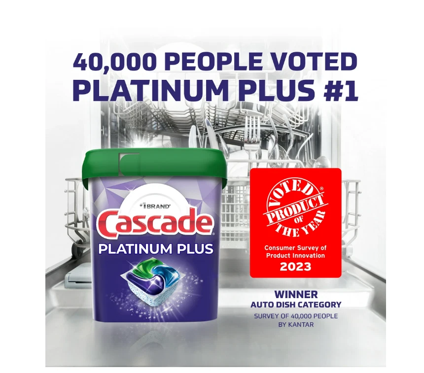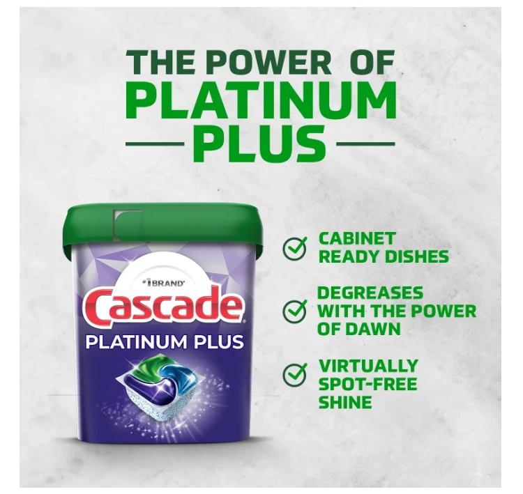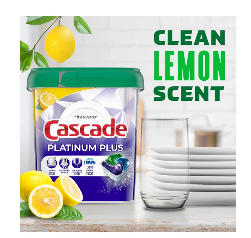 About this item Our best dishwasher detergent for cabinet ready dishes Only Cascade Platinum Plus contains 2X* the Dawn grease fighting power and 2X* the scrubbing power to power through dried on food *Cleaning ingredients vs Cascade Complete ActionPacs Get virtually spotfree sparkling clean dishes on even the toughest messes 40% larger liquid top for even more* cleaning power that still fits in your dishwasher detergent dispenser *vs Cascade Platinum ActionPacs Running the dishwasher daily saves water* Save up to 20 gallons of water per dishwasher load when you skip the pre-wash *ENERGY STAR certified dishwashers use 4 gallons per cycle. Running the tap for 11 minutes handwashing uses up to 24 gallons of water. #1 Recommended Brand in North America* *More dishwasher brands in North America recommend Cascade based on co-marketing agreements vs. other automatic dishwasher detergent brands Formulated to help prevent hard water spots and filming to keep your machine looking fresh and clean Lemon, 62 Count