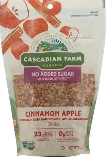 Cascadian Farm Organic Granola with No Added Sugar, Cinnamon Apple Cereal, Resealable Pouch, 11 oz. Description Cascadian Farm Organic Cinnamon Apple Granola is a delightful blend of whole grain oats and apples dusted with cinnamon. Enjoy this cinnamon granola cereal with milk as part of a tasty cold breakfast or eat it by the handful for a quick and easy snack. Best of all, this Cascadian Farm Granola features 23 grams of whole grain per serving and no added sugar, sweetened with fruit. The rich, sweet flavor of dates gives this organic granola just the right hint of sweetness. Now in a convenient resealable pouch. 23g whole grains per serving. At least 48g recommended daily. This no added sugar granola is sweetened with dried date powder. See ingredients for complete list of ingredients. Cascadian Farm has spent more than 50 years working to protect our planet through actions like planting pollinator habitats, helping farmers build healthy soil, and integrating climate-smart crops into our products. Step- by- step, we are reimagining the relationship between food, farmland, nature & communities, seeking to drive and inspire meaningful change along the way. Features: NO ADDED SUGAR: This granola is sweetened with fruit with no added sugar; Comes in a convenient, resealable pouch for maximum freshness and easy opening CINNAMON APPLE GRANOLA: Enjoy this tasty blend of whole grain oats and apples dusted with cinnamon NON-GMO: USDA Certified Organic non-GMO granola WHOLESOME INGREDIENTS: This organic granola has 23 grams of whole grain per serving CONTAINS: 11 oz Product Details: Brand: Cascadian Farm Flavor: Cinnamon Apple Age Range (Description): Adult Item Form: Granola Specialty: Organic Product Dimensions : 3 x 6.5 x 9.5 inches; 11.36 ounces Item model number : 8 UPC : Manufacturer : GENERAL MILLS SALES INC. Country of Origin : USA Handling We will ship all orders within 3 business days of payment. Delivery We do not ship outside of the Continental US. Feedback We take our reputation seriously, we buy and sell online, so we understand the value of trust. If you are unsatisfied with your order, please contact us and we will work with you to resolve it to your satisfaction.