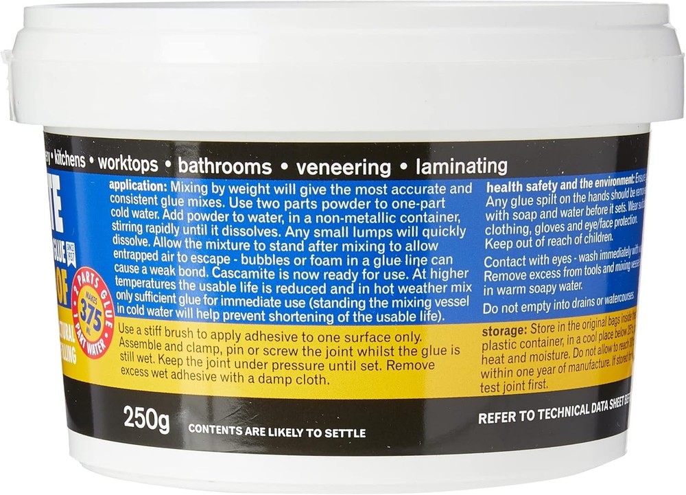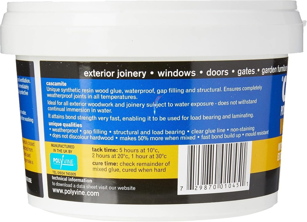 Cascamite Powdered Resin Wood Glue 220g Clear Product Details Brand: Polyvine Specific Uses For Product: Gates, Garden Furniture, Exterior Joinery Material: Material Compatible Material: Wood Item Form: Powder Special Feature: Waterproof Color: Clear Item Package Quantity: 1 Package Information: Pail Item Volume: 2.2E+2 Milliliters Viscosity: High Viscosity Water Resistance Level: Waterproof Unit Count: 7.7603 Ounce Number of Pieces: 1 Manufacturer: Cascamite Part Number: CAS220G Item Weight: 8.8 ounces Product Dimensions: 4.53 x 4.53 x 3.15 inches Item model number: CAS220G Is Discontinued By Manufacturer: No Special Features: Waterproof Batteries Included?: No Batteries Required?: No Brand: Polyvine Specific Uses For Product: Gates, Garden Furniture, Exterior Joinery Material: Material Compatible Material: Wood Item Form: Powder Polyvine CAS220G Cascamite Powdered Resin Wood Glue 250g Ideal for: Gates, garden furniture and exterior joinery Ideal for Interior or Exterior use. Weather and water resistance Note: The date mentioned on the product is the manufacture date Bonds stronger than the wood itself Humbrol cascamite adhesive (wood)Cascamite is a waterproof, synthetic resin adhesive for use on general joinery - especially outside woodwork and boat building.Supplied as a powder to be mixed with.