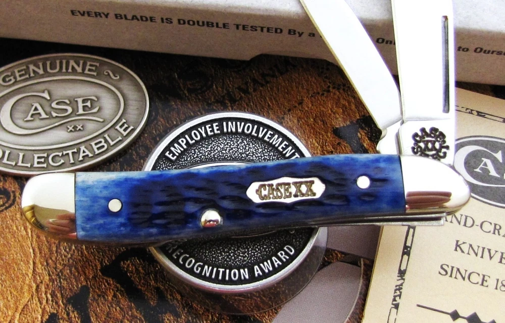 Hi I'm James Parker and I am offering some knives for auction from a fine Case Knife Collection acquisition out of Georgetown, Kentucky. The winning bidder pays $5.95 for USPS Ground Advantage Shipping with Delivery Confirmation included in the Shipping price. This knife for auction is a 1998 issue Case Select Peanut, 2 7/8" closed, featuring the great looking Case "Rogers" Jigged Blue Bone (cattle bone) handles and nickel silver components. This Case Select Peanut originally sold for $59.99 at the few Case Select retailers who were allocated this knife in 1998 - 1999. The master Clip blade is stamped on the front tang with Case XX Select, while the rear tang of this blade is pattern stamped with USA 6220 SS. Both blades have half stops and great "walk and talk" snap. This Case Select Peanut is manufactured with the all nickel silver components. The pins, liners, shield, and bolsters are all composed of nickel silver. This is a desirable feature that Case incorporates into the Case Select Series Knives. Please be sure to see all 5 of the Supersize Photos as this is the EXACT knife the winning bidder will receive. The original carrying pouch is also included - it is in the Case Select box. The Case item number is #02414. This spectacular 1998 issue Case Select Peanut is mint condition in the original issue Case Select factory box with the original Case Select factory brochure and the original older style Case factory paperwork brochure and is being offered at No Reserve. Thanks for your bids, we appreciate it.