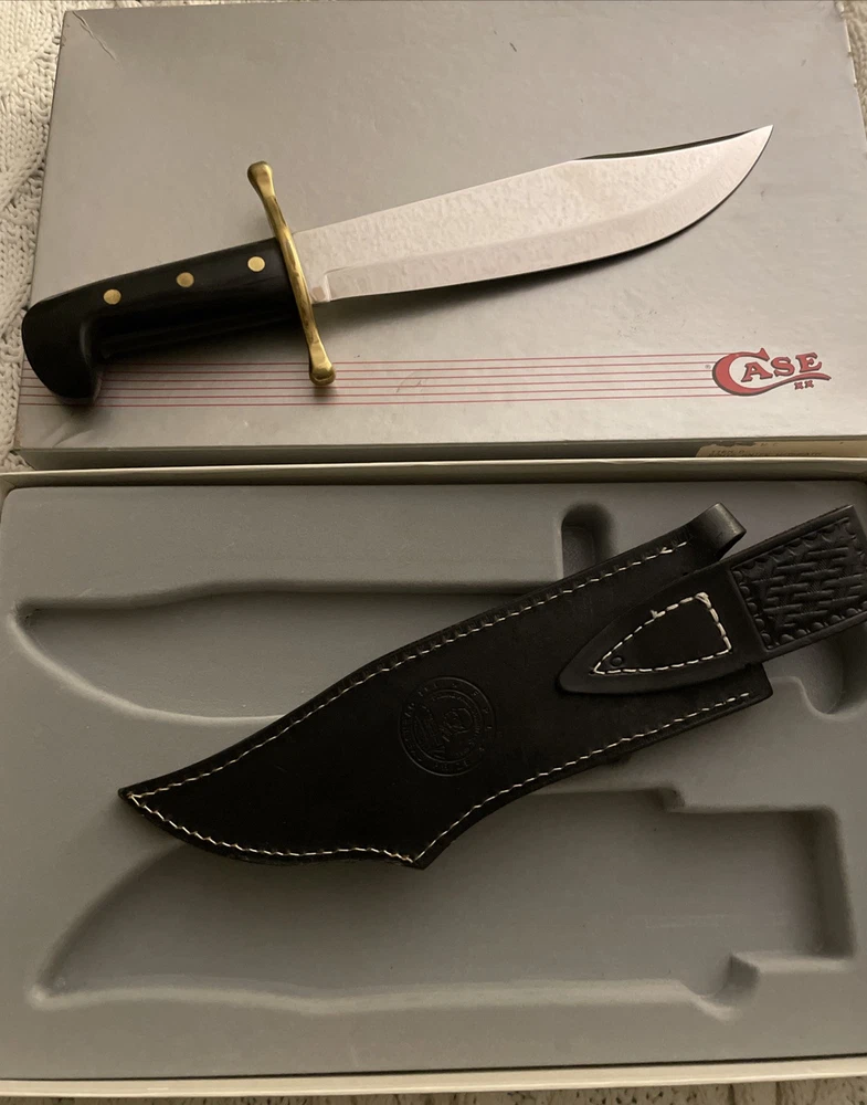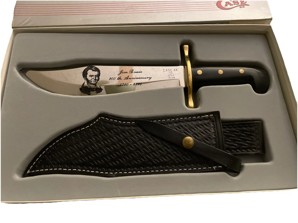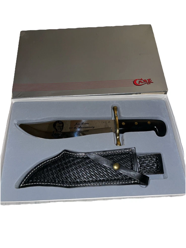 This Case XX USA 1990 Jim Bowie 200th Anniversary Knife features a stainless steel clip point blade with a length of 9.5". The tang is encapsulated, and the handle is made of delrin. It is an original production from the United States, celebrating the 200th anniversary of Jim Bowie. The knife comes in mint condition in its original box, with a sheath included.
