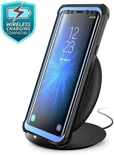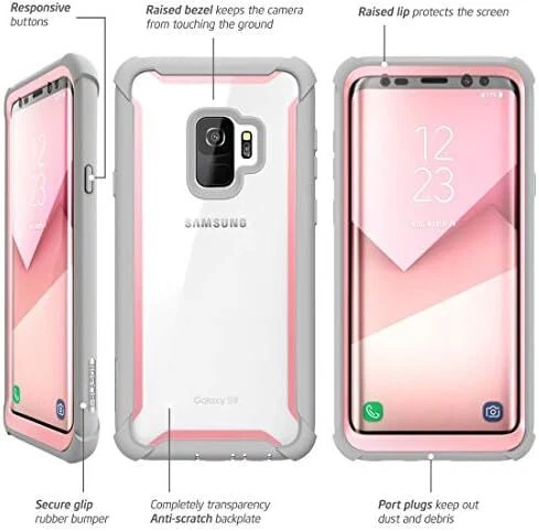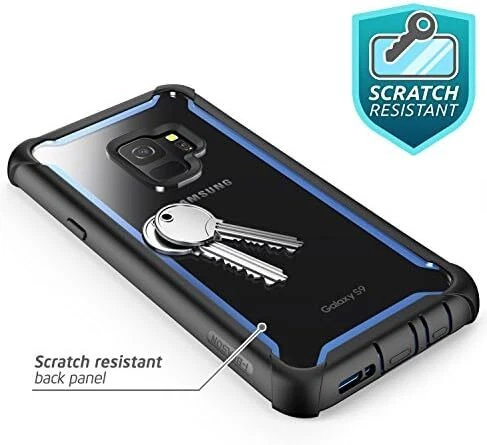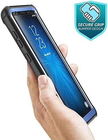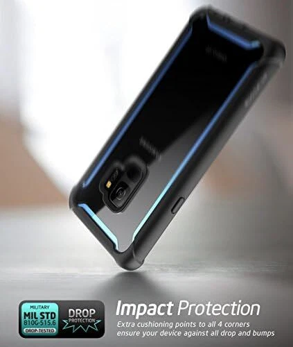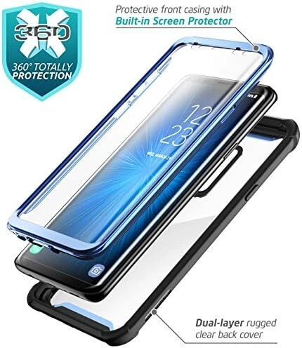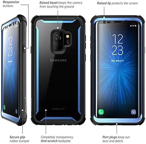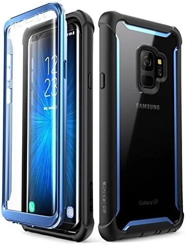 Case for Galaxy S9 2018 Release, Ares Full-body Rugged Clear Bumper Case with Built-in Screen Protector (Black/Blue) 360-degree, full-device protection.,Screen protector built-in, prevents scratches and screen cracks while remaining fully touch-sensitive.,Slim build and clear back plate makes it easy to slip into pockets or purses.,Augmented drop-resistant bumper made of shock-absorbent TPU materials.,Compatible with Samsung Galaxy S9 only. Not for Samsung Galaxy S8/ S8+/ S9+.