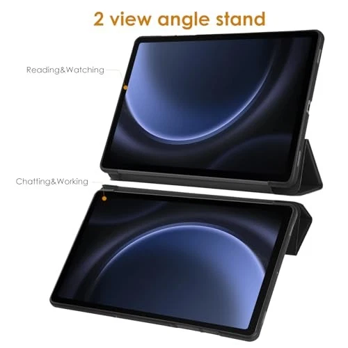 Case for Samsung Galaxy Tab S9 FE 10.9" Shockproof Leather Cover with Auto Sleep Designed specifically for Samsung Galaxy Tab S9 FE 10.9 inch for a perfect fit. Constructed with premium waterproof PU leather exterior and anti-slip interior for durability and grip. Supports two adjustable viewing angles for versatile use, including movie watching and typing modes. Precise cutouts provide easy access to charging port, camera, speakers, and buttons without removing the case. Features auto sleep/wake function and a magnet-secured closure for convenience and security.