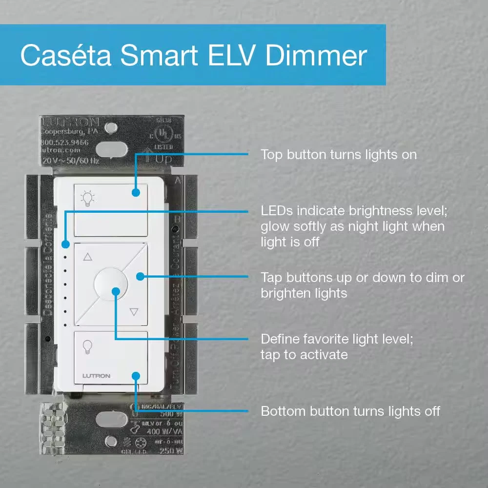 Fast Shipping On All Items 30 Days Money Guarantee Customer Support Excellent Service 100% Satisfaction Satisfaction Guaranteed Caseta Smart Lighting Dimmer Switch for ELV Bulbs, 250W LED Bulbs, Ivory (PD-5NE-IV) Specification Amperage (A) 3.3 A Circuit Connection Single Pole Color Family Beige Color/Finish Ivory Compatible Bulb Type CFL,Halogen,Incandescent,LED Control Function Light Control Style Push Button Dimmable Capability Non Dimmable Durability Not Applicable Electrical Features Programmable Features Programmable,Remote Control Compatible Finish Type Gloss Indoor/Outdoor Indoor Material Resin Mounting Type In-Wall Number of Switches One Package Quantity 1 Returnable 90-Day Voltage (V) 120 V Wall Plate Included No Wall Plate Certifications and Listings UL Listed Manufacturer Warranty 1 Year Product Depth (in) 0.33 in Product Height (in) 4.56 in Product Width (in) 2.93 in 2.93 inches x 0.33 inches x 4.56 inches. Item Description Works w/Alexa, Google Assistant, Ring and more (hub required) Neutral wire required; 10-Watt minimum load Pair with a Pico remote for wireless control of your lights Bring Technology and style to your home with the Lutron Caseta ELV+ dimmer. Caseta by Lutron allows you to control your lights from anywhere within your home with the Pico remote control (sold separately) or from anywhere with your mobile device via the free app and Lutron Caseta Smart Hub (also sold separately). The Caseta ELV+ Dimmer allows you to recall your favorite light level with the new preset button for added convenience and is designed to control many loads types: 500-Watt of incandescent, halogen or electronic low-voltage, 400-Watt of magnetic low-voltage and 250-Watt of dimmable LED or dimmable CFL (neutral wire connection and 10-Watt minimum load required for all load types). Out of the box the dimmer is set to control ELV, incandescent, halogen and many compatible LEDs, however is phase selective the dimmer output can be changed for MLV and certain LED bulbs with simple button press programming. The Caseta ELV+ dimmer is a great solution for LED fixtures with integrated, built-in drivers, ELV track lights and problem LEDs that may prefer an ELV dimmer. To use in a multi-location application, replace the existing switch with a Pico remote control and wall plate adapter (both sold separately). Please note, wall plate for dimmer is also sold separately. About us We offer the best prices around on high quality products. Our E-store includes media such as books, movies, music and games while offering electronics, toys, sporting apparel, clothing, tools, general home, garden items and more. Shipping We are always working hard to ensure your package arrives as soon as possible. Please understand that some factors like weather, high postal traffic, and the performance of shipping companies are outside of our control. We offer free shipping to the lower 48 states and ship within 2-3 business days of payment, usually sooner. We do not accept P.O. Boxes. Please provide a physical address. For shipping outside of the continental USA, we only use eBay's Global Shipping Program.The item is shipped to KY and then sent to the rest of the world. International customers are responsible for all duties and taxes. Continue to check out to calculate costs for shipping the item to your country. Messages regarding eBay's Global Shipping Program MUST be directed at eBay EXCLUSIVELY. Returns We offer a 30-Day Return Policy on items in which you are not completely satisfied with. You have the option of a full-refund or an exchange of the item. No returns are available on items shipped outside of the USA Satisfaction We try over very best to make sure every customer is completely satisfied. If there's a problem, message us! We're happy to help. Payment Options Shop With Confidence