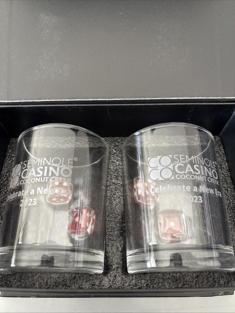 The Casino Dice Embedded Whiskey Glass Gift Set is a unique and stylish gift set perfect for any whiskey lover or casino enthusiast. Made from hand-blown clear glass, the set includes a pair of drinking glasses featuring a design of embedded dice, reminiscent of the Seminole Casino. The set is adorned with a theme of bar, nightlife, casino, party, and fun, making it a perfect addition to any home bar or entertaining collection. Each glass comes with a gift box, making it a great gift for any occasion.