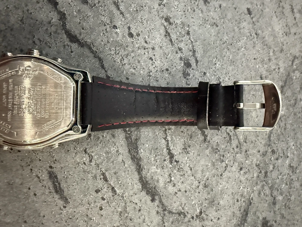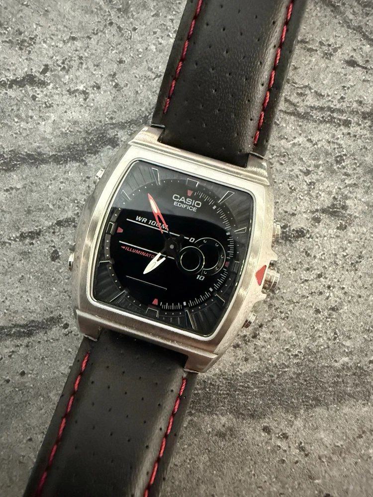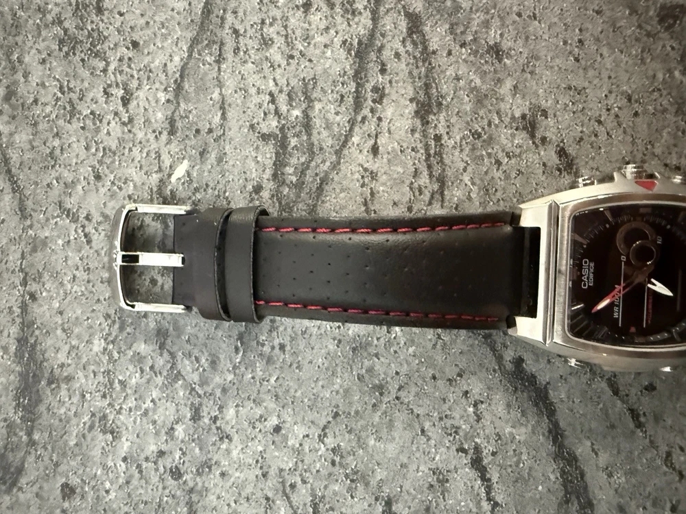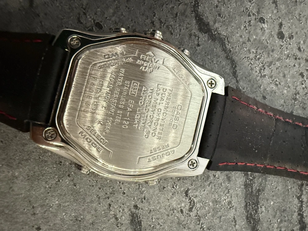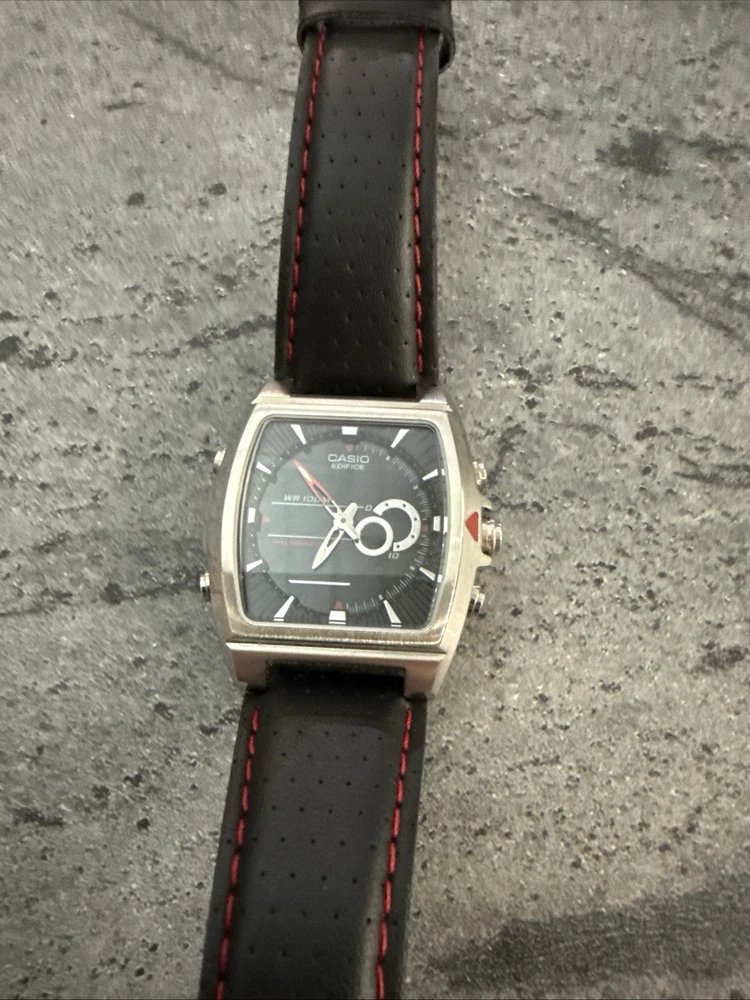 A la venta un reloj de pulsera Casio Edifice EFA-120 para hombre, con una elegante caja rectangular de acero inoxidable y una esfera negra con detalles en rojo. Este reloj está repleto de funciones, que incluyen: ✔ Cronógrafo con memoria de vuelta (50 discos) ✔ Termómetro incorporado para lecturas de temperatura ✔ Función de hora mundial ✔ Luz automática para facilitar la lectura ✔ Resistencia al agua de hasta 100M