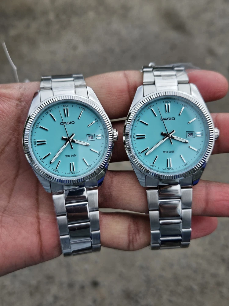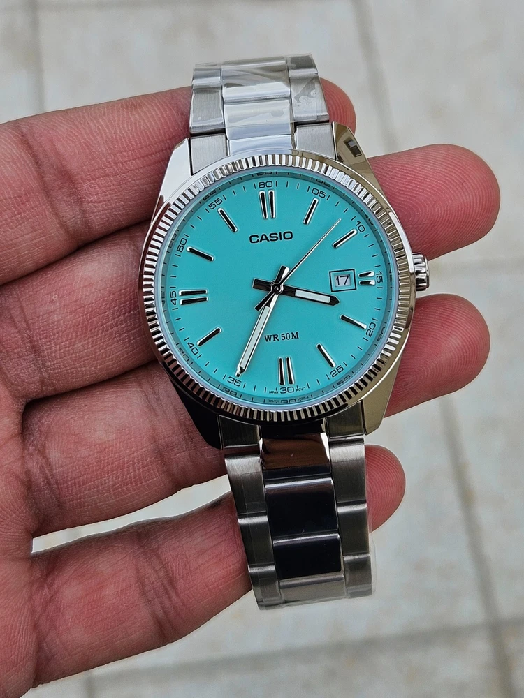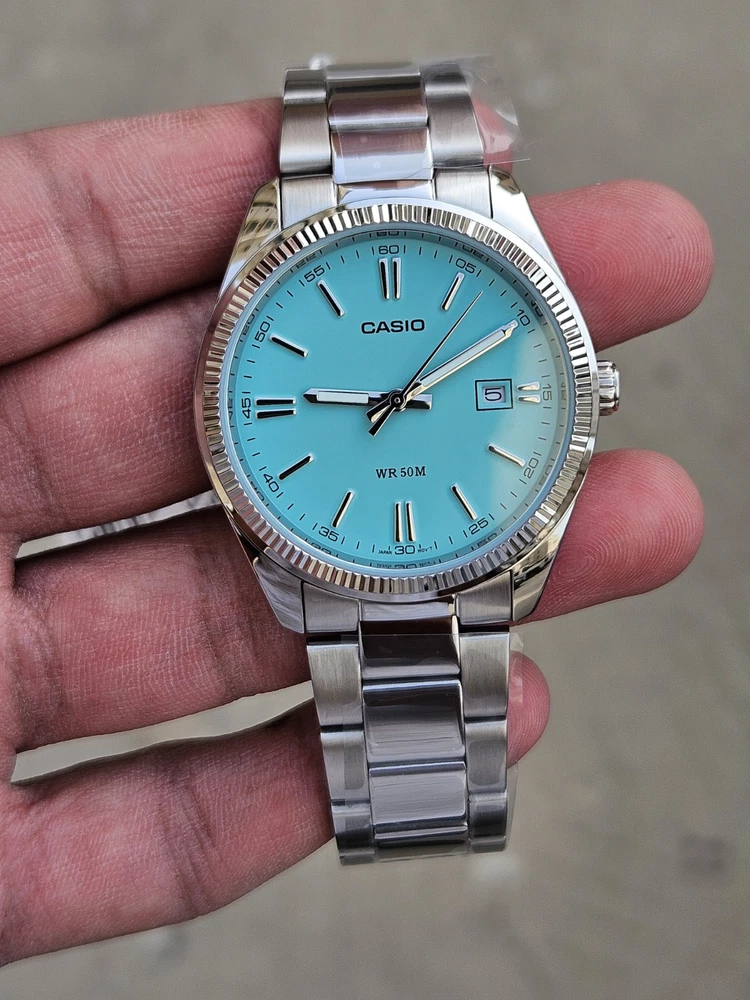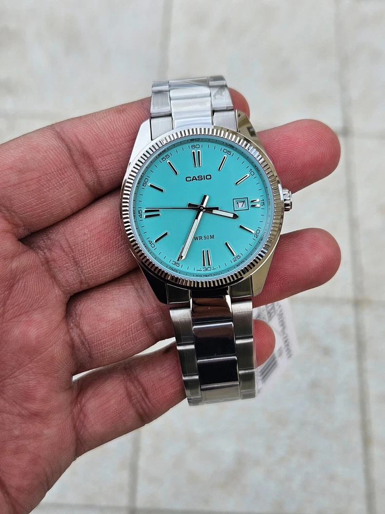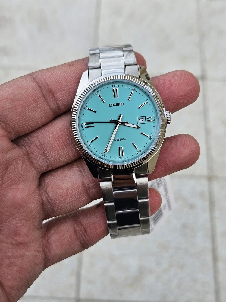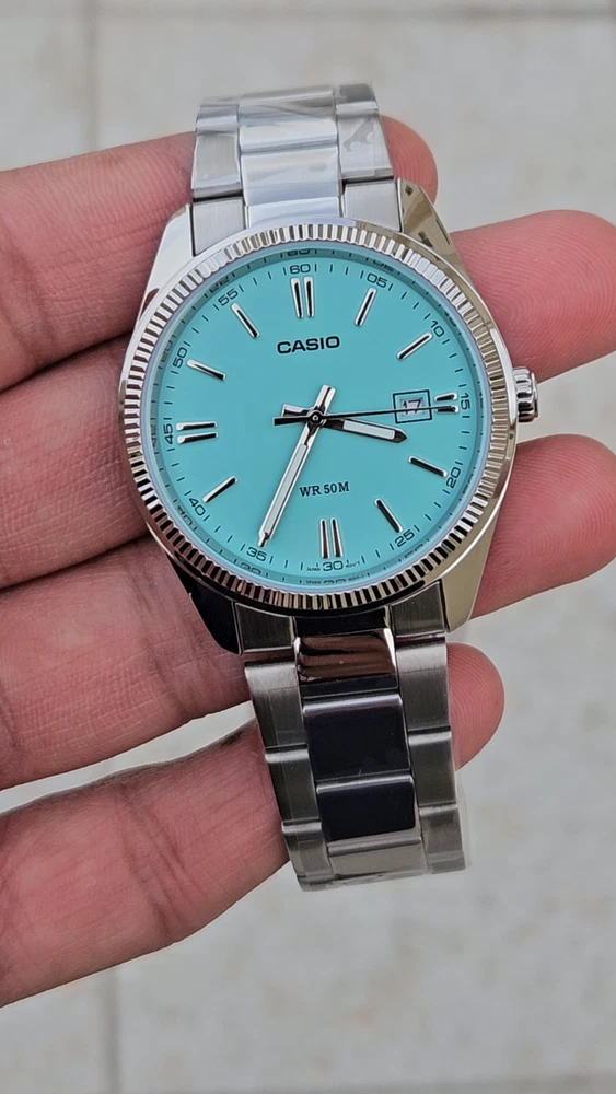 "This Casio MTP-1302PD features a stunning Tiffany Blue dial with a minimalist design, perfect for both casual and formal occasions. It has a date display at the 3 o’clock position and a durable stainless steel case and band. Powered by a reliable quartz movement, this watch ensures precise timekeeping. With its classic yet modern look, this is a must-have for any watch enthusiast!"
