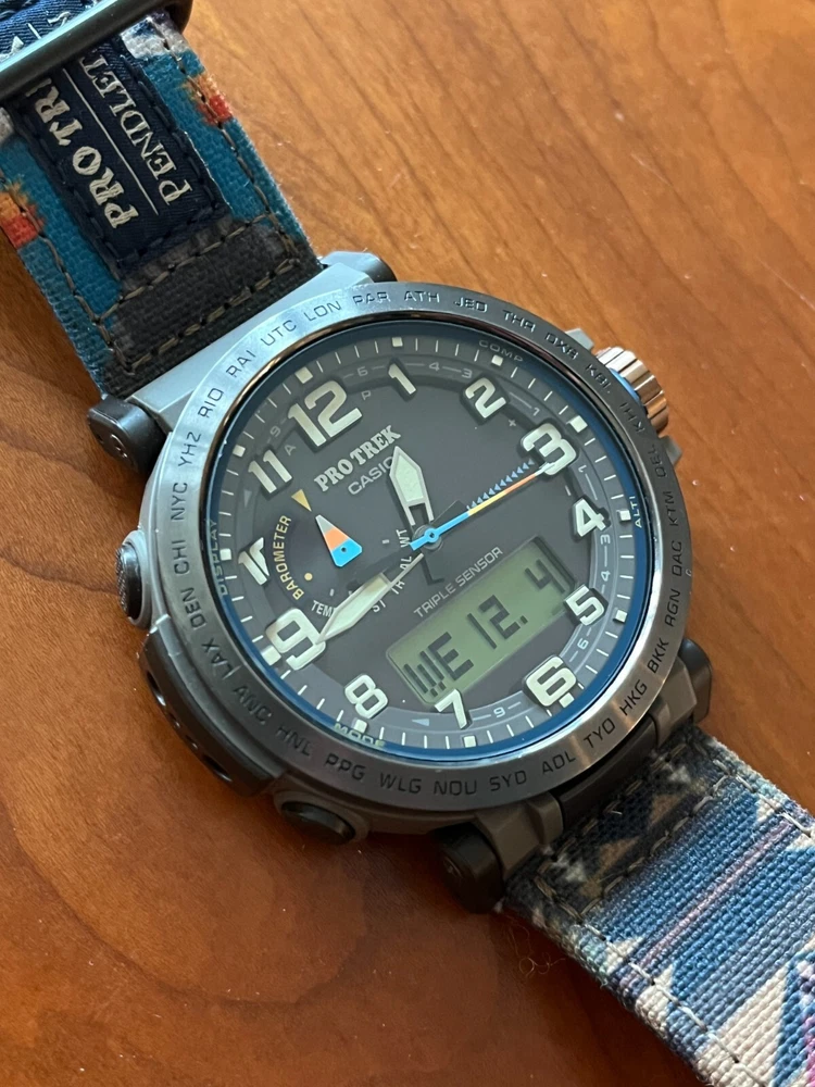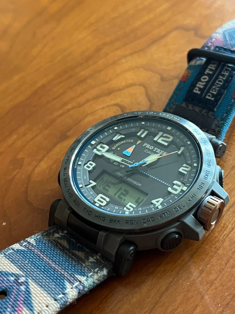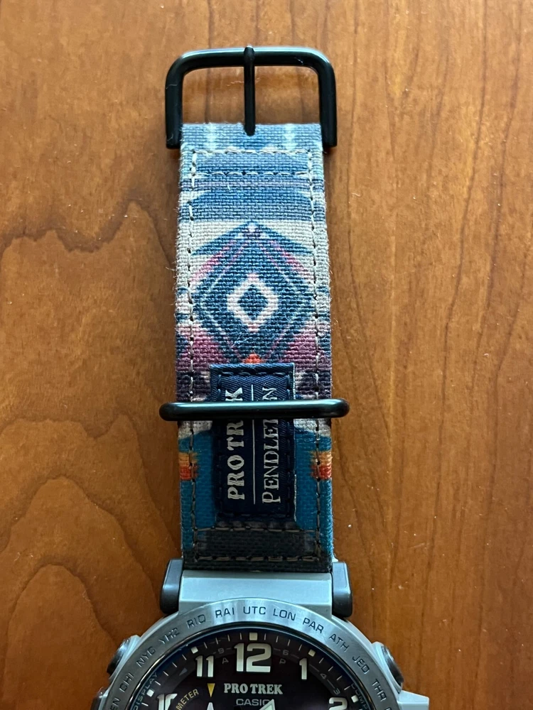 Casio Pendleton PRO TREK PRG-601PE-5JR Pre-Owned Limited Edition Watch. ALL SALES FINAL. Minor Scratches and wear on band. Overall in good condition. Worn less than 10 times. What you see in the photos is what comes with the watch. The watch is too big for my wrist, that's why I'm selling it. Message me for any questions ALL SALES FINAL.